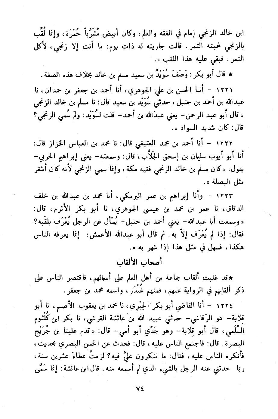 1221 - أنا الْحَسَنُ بْنُ عَلِيٍّ الْجَوْهَرِيُّ، أنا أَحْمَدُ بْنُ جَعْفَرِ بْنِ حَمْدَانَ، نا عَبْدُ اللَّهِ بْنُ أَحْمَدَ بْنِ حَنْبَلٍ، حَدَّثَنِي سُوَيْدُ بْنُ سَعِيدٍ، قَالَ: نا مُسْلِمُ بْنُ خَالِدٍ الزَّنْجِيُّ، قَالَ أَبُو عَبْدِ الرَّحْمَنِ يَعْنِي عَبْدَ اللَّهِ بْنَ أَحْمَدَ: " قُلْتُ لِسُوَيْدٍ: §وَلِمَ سُمِّيَ الزَّنْجِيُّ قَالَ: «كَانَ شَدِيدُ السَّوَادِ»