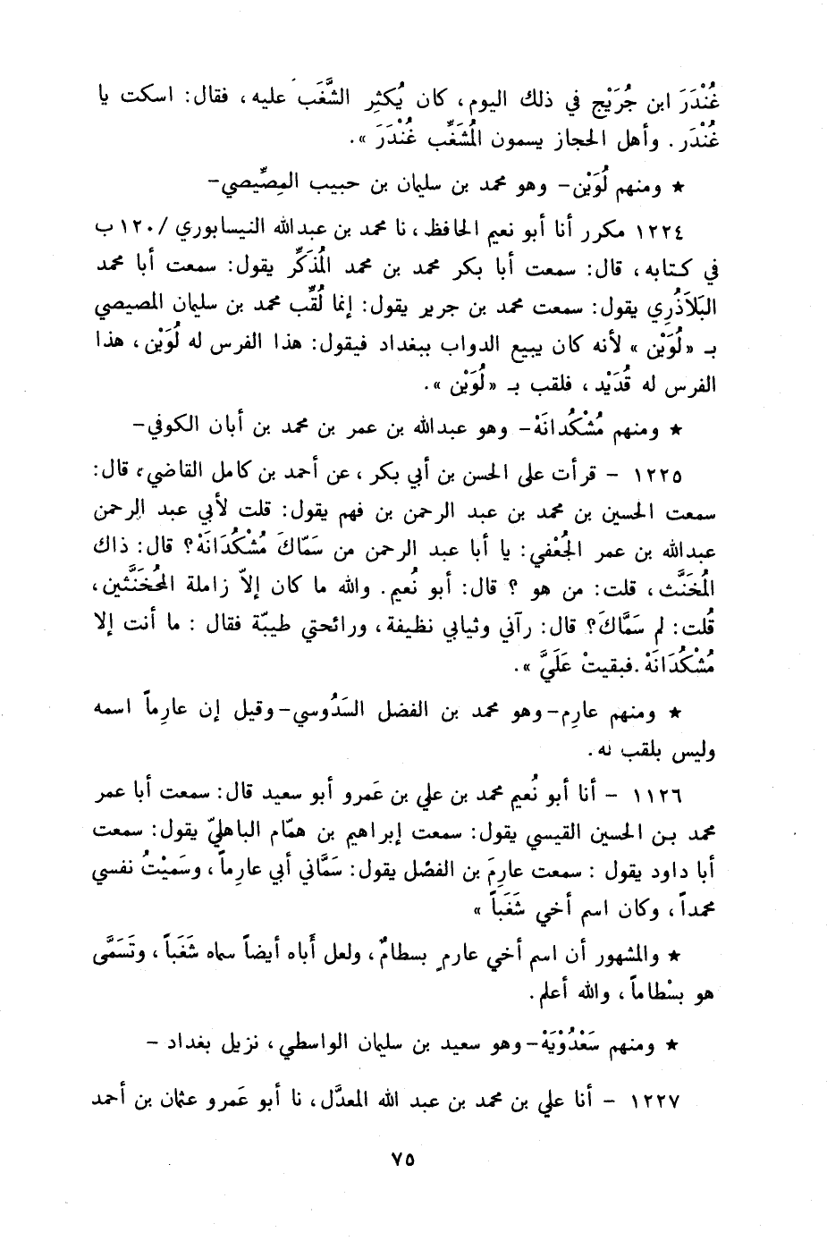 أنا أَبُو نُعَيْمٍ الْحَافِظُ، نا مُحَمَّدُ بْنُ عَبْدِ اللَّهِ النَّيْسَابُورِيُّ فِي كِتَابِهِ قَالَ: سَمِعْتُ أَبَا بَكْرٍ مُحَمَّدَ بْنَ مُحَمَّدٍ الْمُذَكِّرُ يَقُولُ: سَمِعْتُ أَبَا مُحَمَّدٍ الْبَلَاذُرِيَّ، يَقُولُ: سَمِعْتُ مُحَمَّدَ بْنَ جَرِيرٍ، يَقُولُ: §«إِنَّمَا لُقِّبَ مُحَمَّدُ بْنُ سُلَيْمَانَ الْمِصِّيصِيُّ بِلُوَيْنٍ لِأَنَّهُ كَانَ يَبِيعُ الدَّوَابَّ بِبَغْدَادَ فَيَقُولُ هَذَا الْفَرَسُ لَهُ لُوَيْنٌ هَذَا الْفَرَسُ لَهُ قُدَيْدٌ فَلُقِّبَ بِلُوَيْنٌ» وَمِنْهُمْ مُشْكَدَانَهْ وَهُوَ: عَبْدُ اللَّهِ بْنُ عُمَرَ بْنِ مُحَمَّدِ بْنِ أَبَانَ الْكُوفِيُّ