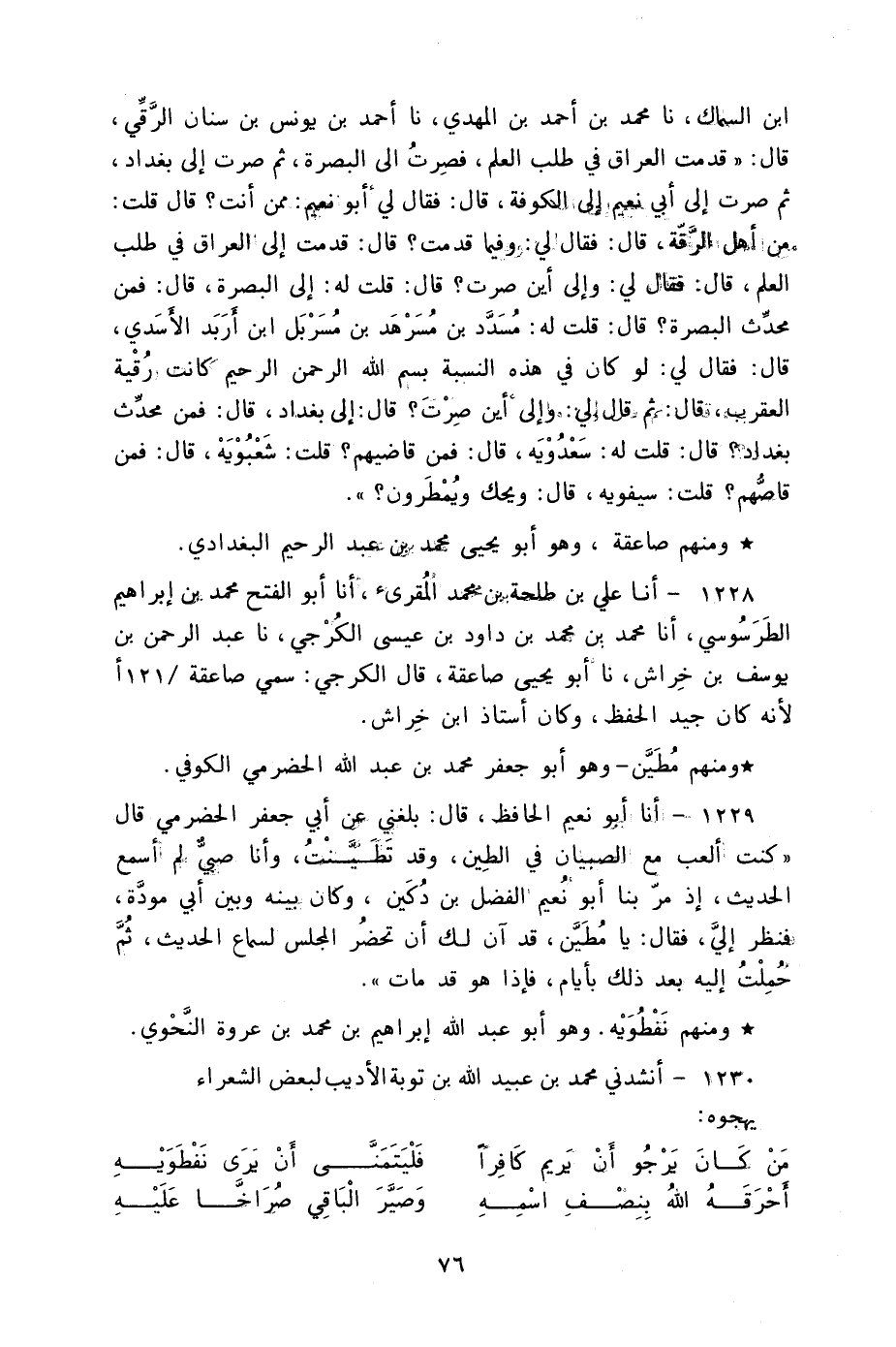 1228 - أنا عَلِيُّ بْنُ طَلْحَةَ بْنِ مُحَمَّدٍ الْمُقْرِئُ، أنا أَبُو الْفَتْحِ مُحَمَّدُ بْنُ إِبْرَاهِيمَ الطَّرَسُوسِيُّ أنا مُحَمَّدُ بْنُ مُحَمَّدِ بْنِ دَاوُدَ بْنِ عِيسَى الْكُرْجِيُّ، نا عَبْدُ الرَّحْمَنِ بْنُ يُوسُفَ بْنِ خِرَاشٍ، نا أَبُو يَحْيَى صَاعِقَةُ قَالَ الْكُرْجِيُّ: §«سُمِّيَ صَاعِقَةَ لِأَنَّهُ كَانَ جَيِّدُ الْحِفْظِ وَكَانَ أُسْتَاذُ ابْنِ خِرَاشٍ» وَمِنْهُمْ مُطَيَّنٌ وَهُوَ: أَبُو جَعْفَرٍ مُحَمَّدُ بْنُ عَبْدِ اللَّهِ الْحَضْرَمِيُّ الْكُوفِيُّ
