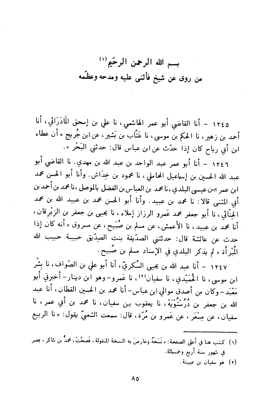 1247 - أنا عَبْدُ اللَّهِ بْنُ يَحْيَى السُّكَّرِيُّ، أنا أَبُو عَلِيِّ بْنُ الصَّوَّافِ، نا بِشْرُ بْنُ مُوسَى، نا الْحُمَيْدِيُّ، نا سُفْيَانُ، نا عَمْرٌو وَهُوَ ابْنُ دِينَارٍ، §أَخْبَرَنِي أَبُو مَعْبَدٍ، وَكَانَ مِنْ أَصْدَقِ مَوَالِي ابْنِ عَبَّاسٍ"