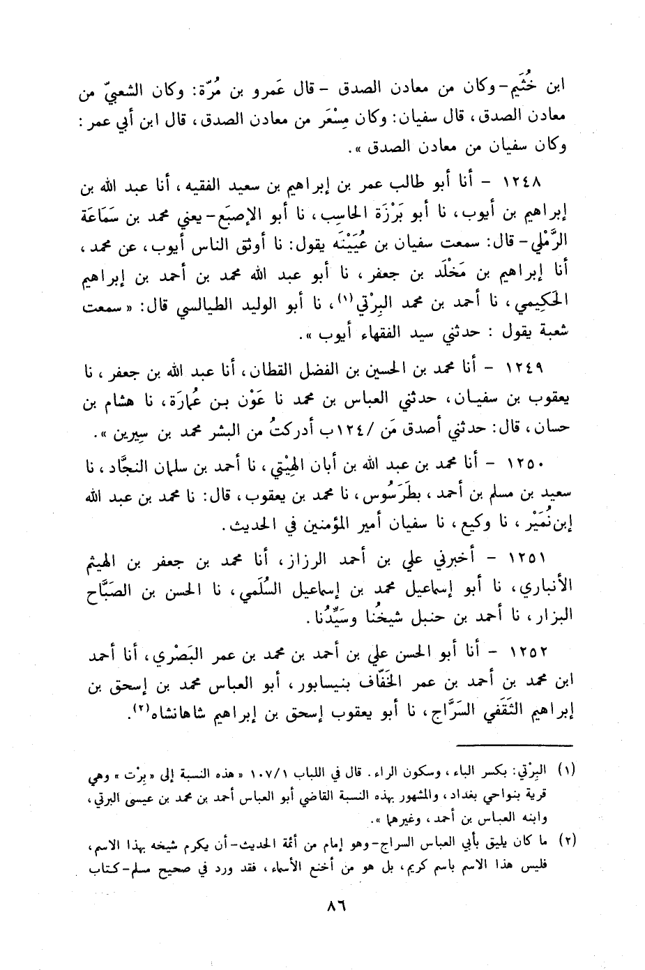 1252 - أنا أَبُو الْحَسَنِ عَلِيُّ بْنُ أَحْمَدَ بْنِ مُحَمَّدِ بْنِ عُمَرَ الْبَصْرِيُّ أنا أَحْمَدُ بْنُ مُحَمَّدِ بْنِ أَحْمَدَ بْنِ عُمَرَ الْخَفَّافُ، بِنَيْسَابُورَ أَبُو الْعَبَّاسِ مُحَمَّدُ بْنُ إِسْحَاقَ بْنِ إِبْرَاهِيمَ الثَّقَفِيُّ السَّرَّاجُ: §«نَا أَبُو يَعْقُوبَ إِسْحَاقُ بْنُ إِبْرَاهِيمَ شَاهِنْشَاهْ»