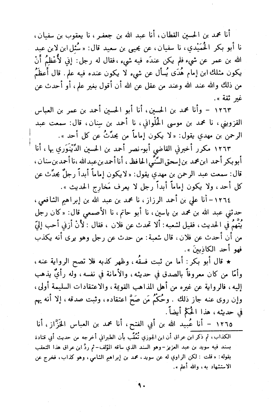 1262 - وأنا مُحَمَّدُ بْنُ الْحُسَيْنِ، أنا أَبُو الْحُسَيْنِ أَحْمَدُ بْنُ عُمَرَ بْنِ الْعَبَّاسِ الْقَزْوِينِيُّ نا مُحَمَّدُ بْنُ مُوسَى الْحُلْوَانِيُّ، نا أَحْمَدُ بْنُ سِنَانٍ، قَالَ: سَمِعْتُ عَبْدَ الرَّحْمَنِ بْنَ مَهْدِيٍّ، يَقُولُ: §«لَا يَكُونُ إِمَامًا مَنْ يُحَدِّثُ عَنْ كُلِّ أَحَدٍ»