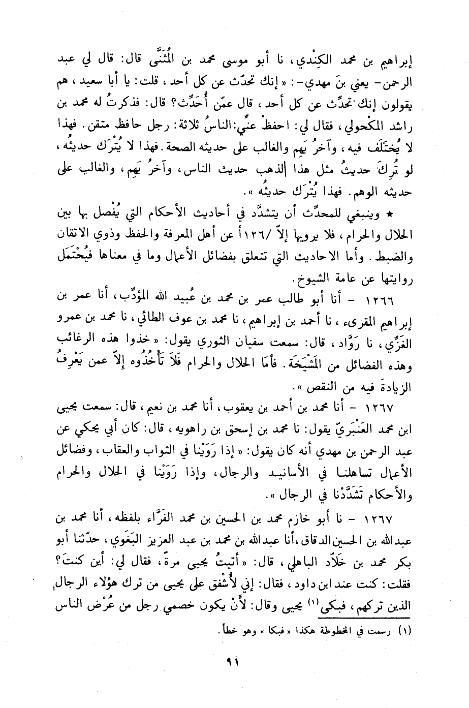1267 - أنا مُحَمَّدُ بْنُ أَحْمَدَ بْنِ يَعْقُوبَ، أنا مُحَمَّدُ بْنُ نُعَيْمٍ، قَالَ: سَمِعْتُ يَحْيَى بْنَ مُحَمَّدٍ الْعَنْبَرِيَّ، يَقُولُ: نا مُحَمَّدُ بْنُ إِسْحَاقَ بْنِ رَاهَوَيْهِ، قَالَ: كَانَ أَبِي يَحْكِي عَنْ عَبْدِ الرَّحْمَنِ بْنِ مَهْدِيٍّ، أَنَّهُ كَانَ يَقُولُ: «§إِذَا رَوِينَا فِي الثَّوَابِ وَالْعِقَابِ وَفَضَائِلِ الْأَعْمَالِ، تَسَاهَلْنَا فِي الْأَسَانِيدِ وَالرِّجَالِ، وَإِذَا رَوِينَا فِي الْحَلَالِ وَالْحَرَامِ وَالْأَحْكَامِ تَشَدَّدْنَا فِي الرِّجَالِ»