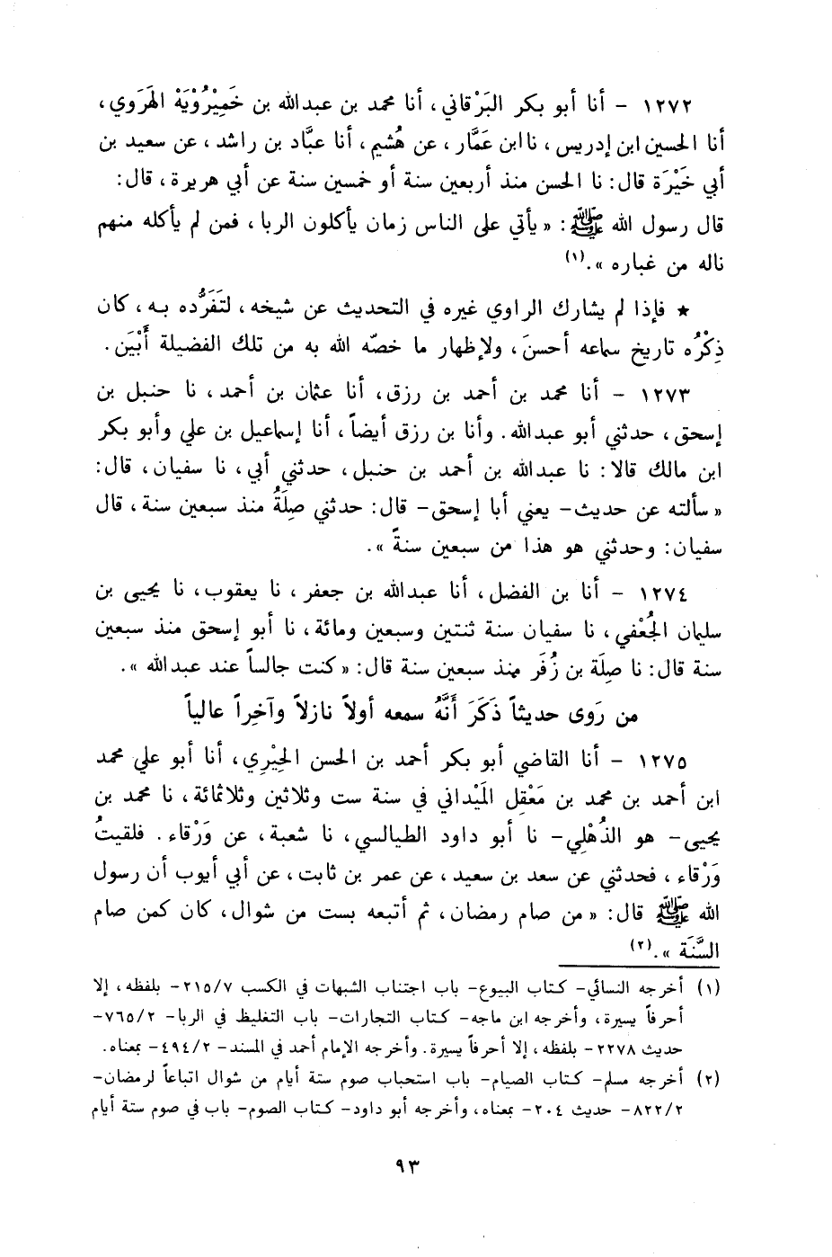 1272 - أنا أَبُو بَكْرٍ الْبَرْقَانِيُّ، أنا مُحَمَّدُ بْنُ عَبْدِ اللَّهِ بْنُ خُمَيْرَوَيْهِ الْهَرَوِيُّ أنا الْحُسَيْنُ بْنُ إِدْرِيسَ، نا ابْنُ عَمَّارٍ، عَنْ هُشَيْمٍ، أنا عَبَّادُ بْنُ رَاشِدٍ، عَنْ سَعِيدِ بْنِ أَبِي خَيْرَةَ، قَالَ: نا الْحَسَنُ، مُنْذُ أَرْبَعِينَ سَنَةً أَوْ خَمْسِينَ سَنَةً عَنْ أَبِي هُرَيْرَةَ قَالَ: قَالَ رَسُولُ اللَّهِ صَلَّى اللهُ عَلَيْهِ وَسَلَّمَ: «§يَأْتِي عَلَى النَّاسِ زَمَانٌ يَأْكُلُونَ الرِّبَا، فَمَنْ لَمْ يَأْكُلْهُ مِنْهُمْ نَالَهُ مِنْ غُبَارِهِ» فَإِذَا لَمْ يُشَارِكِ الرَّاوِي غَيْرَهُ فِي التَّحْدِيثِ عَنْ شَيْخِهِ لِتَفَرُّدِهِ بِهِ كَانَ ذِكْرُهُ تَارِيخَ سَمَاعِهِ أَحْسَنَ وَلِإِظْهَارِ مَا خَصَّهُ اللَّهُ بِهِ مِنْ تِلْكِ الْفَضِيلَةِ أَبْيَنَ