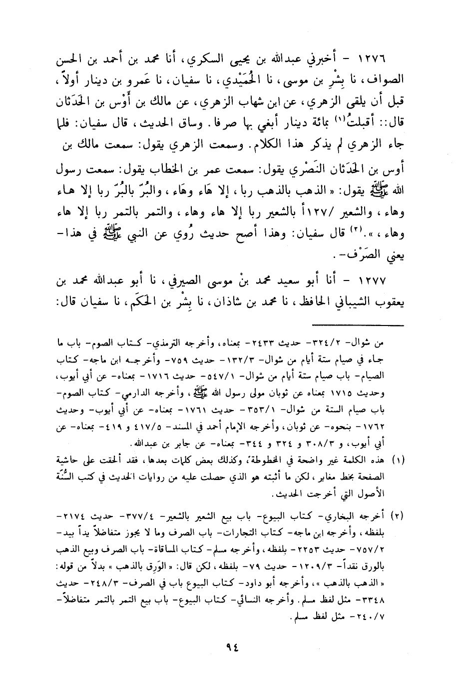 1276 - أَخْبَرَنِي عَبْدُ اللَّهِ بْنُ يَحْيَى السُّكَّرِيُّ، أنا مُحَمَّدُ بْنُ أَحْمَدَ بْنِ الْحَسَنِ الصَّوَّافُ، نا بِشْرُ بْنُ مُوسَى، نا الْحُمَيْدِيُّ، نا سُفْيَانُ، نا عَمْرُو بْنُ دِينَارٍ، أَوَّلًا قَبْلَ أَنْ يَلْقَى الزُّهْرِيَّ، عَنِ ابْنِ شِهَابٍ الزُّهْرِيِّ، عَنْ مَالِكِ بْنِ أَوْسِ بْنِ الْحَدَثَانِ، قَالَ: أَقْبَلْتُ بِمِائَةِ دِينَارٍ أَبْغِي بِهَا صَرْفًا وَسَاقَ الْحَدِيثَ قَالَ سُفْيَانُ: فَلَمَّا جَاءَ الزُّهْرِيُّ لَمْ يَذْكُرْ هَذَا الْكَلَامَ وَسَمِعْتُ الزُّهْرِيَّ يَقُولُ: سَمِعْتُ مَالِكَ بْنَ أَوْسِ بْنِ الْحَدَثَانِ النَّصْرِيَّ يَقُولُ: سَمِعْتُ عُمَرَ بْنَ الْخَطَّابِ يَقُولُ: سَمِعْتُ رَسُولَ اللَّهِ صَلَّى اللهُ عَلَيْهِ وَسَلَّمَ يَقُولُ: «§الذَّهَبُ بِالذَّهَبِ رِبًا إِلَّا هَاءَ وَهَاءَ، وَالْبُرُّ بِالْبُرِّ رِبًا إِلَّا هَاءَ وَهَاءَ وَالشَّعِيرُ بِالشَّعِيرِ رِبًا إِلَّا هَاءَ وَهَاءَ، وَالتَّمْرُ بِالتَّمْرِ رِبًا إِلَّا هَاءَ وَهَاءَ» . قَالَ سُفْيَانُ: «وَهَذَا أَصَحُّ حَدِيثٍ رُوِيَ عَنِ النَّبِيِّ صَلَّى اللهُ عَلَيْهِ وَسَلَّمَ فِي هَذَا يَعْنِي الصَّرْفَ»