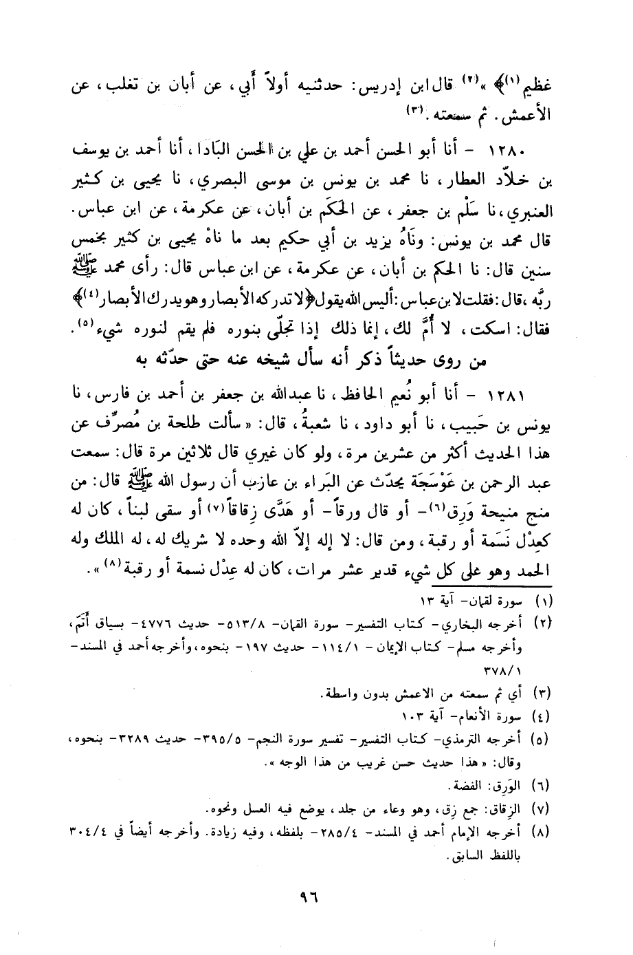 1281 - أنا أَبُو نُعَيْمٍ الْحَافِظُ، نا عَبْدُ اللَّهِ بْنُ جَعْفَرِ بْنِ أَحْمَدَ بْنِ فَارِسٍ، نا يُونُسُ بْنُ حَبِيبٍ، نا أَبُو دَاوُدَ، نا شُعْبَةُ، قَالَ: سَأَلْتُ طَلْحَةَ بْنَ مُصَرِّفٍ عَنْ هَذَا الْحَدِيثِ، أَكْثَرَ مِنْ عِشْرِينَ مَرَّةً وَلَوْ كَانَ غَيْرِي قَالَ ثَلَاثِينَ مَرَّةً قَالَ: سَمِعْتُ عَبْدَ الرَّحْمَنِ بْنَ عَوْسَجَةَ يُحَدِّثُ عَنِ الْبَرَّاءِ بْنِ عَازِبٍ أَنَّ رَسُولَ اللَّهِ صَلَّى اللهُ عَلَيْهِ وَسَلَّمَ قَالَ: " §مَنْ مَنَحَ مَنِيحَةَ وَرِقٍ أَوْ قَالَ وَرِقًا أَوْ هَدَى زُقَاقًا أَوْ سَقَى لَبَنًا كَانَ لَهُ كَعَدْلِ نَسَمَةٍ أَوْ رَقَبَةٍ وَمَنْ قَالَ: لَا إِلَهَ إِلَّا اللَّهُ وَحْدَهُ لَا شَرِيكَ لَهُ لَهُ الْمُلْكُ وَلَهُ الْحَمْدُ وَهُوَ عَلَى كُلِّ شَيْءٍ قَدِيرٌ عَشْرَ مَرَّاتٍ كَانَ لَهُ عَدْلَ نَسَمَةٍ أَوْ رَقَبَةٍ "