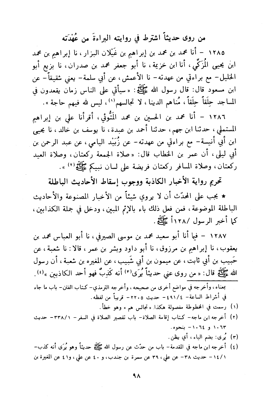§مَنْ رَوَى حَدِيثًا اشْتَرَطَ فِي رِوَايَتِهِ الْبَرَاءَةَ مِنْ عُهْدَتِهِ