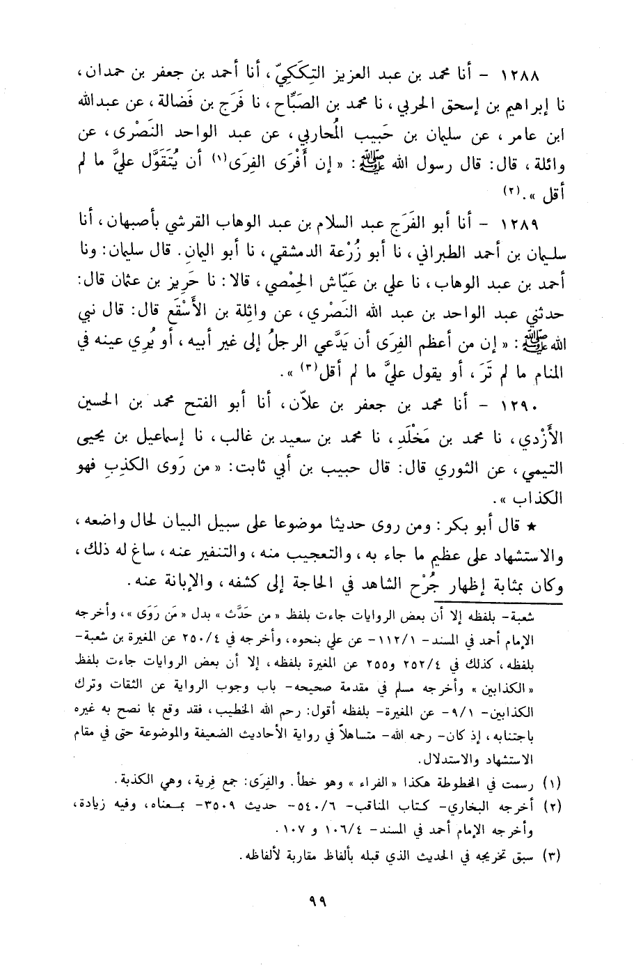 1288 - أنا مُحَمَّدُ بْنُ عَبْدِ الْعَزِيزِ التِّكَكِيُّ، أنا أَحْمَدُ بْنُ جَعْفَرِ بْنِ حَمْدَانَ، نا إِبْرَاهِيمُ بْنُ إِسْحَاقَ الْحَرْبِيُّ، نا مُحَمَّدُ بْنُ الصَّبَّاحِ، نا فَرَجُ بْنُ فَضَالَةَ، عَنْ عَبْدِ اللَّهِ بْنِ عَامِرٍ، عَنْ سُلَيْمَانَ بْنِ حَبِيبٍ الْمُحَارِبِيِّ، عَنْ عَبْدِ الْوَاحِدِ النَّصْرِيِّ، عَنْ وَائِلَةَ، قَالَ: قَالَ رَسُولُ اللَّهِ صَلَّى اللهُ عَلَيْهِ وَسَلَّمَ: «إِنَّ §أَفْرَى الْفِرَى أَنْ يُتَقَوَّلَ عَلَيَّ مَا لَمْ أَقُلْ»