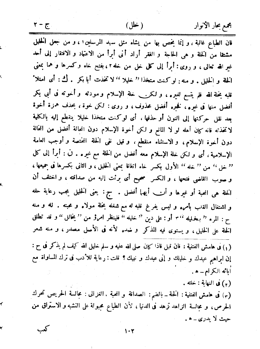 فإن الطباع غالبة، وإنما يخص بها من يشاء مثل سيد المرسلين، ومن جعل الخليل مشتقًا من الخلة وهي الحاجة والفقر أراد أني أبرأ من الاعتماد والافتقار إلى أحد غير الله تعالى، وروى: أبرأ إلى كل خل من خله، بفتح خاء وكرها وهما بمعنى الخلة والخليل. ومنه: لو كنت متخذًا "خليلًا" لاتخذت أبا بكر. ك: أي امتلأ قلبه بخلة الله فلم يتسع لغيره، ولكن خلة الإسلام ومودته وأخوته في أبي بكر أفضل منها في غيره، فخبره أفضل محذوف، وروى: لكن خوة، بحذف همزة أخوة بعد نقل حركتها إلى النون أو حذفها، أي لو كنت متخذًا خليلًا ينقطع إليه بالكلية لاتخذته فإنه كانأهله لولا المانع ولكن أخوة الإسلام دون المجالة أفضل من المخالة دون أخوة الإسلام، والاستثناء منقطع، وقيل نفي الخلة المختصة وأوجب العامة الإسلامية، أي ولكن خلة الإسلام معه أفضل من الخلة مع غيره. ن: أبرأ إلى كل "خل" من "خله" الأول كبسر خاء اتفاقًا بمعنى الخليل، والثاني بكسرها في جميعها، وصوب القاضي فتحها، والكسر صحيح أي برئت إليه من صداقته، واختلف أن الخلة هي المحبة أو غيرها وأن أيهما أفضل. ج: يعني الخليل يجب رعاية حقه واشتغال القلب بأمره وليس يفرغ قلبه له مع شغله بخلة مولاه ومحبته. نه ومنه ح: المرء "بخليله" أو: على دين "خليله" فلينظر امرؤ من "يخالل" وقد تطلق الخلة على الخليل، ويستوي فيه المذكر وضده لأنه في الأصل مصدر، ومنه شعر