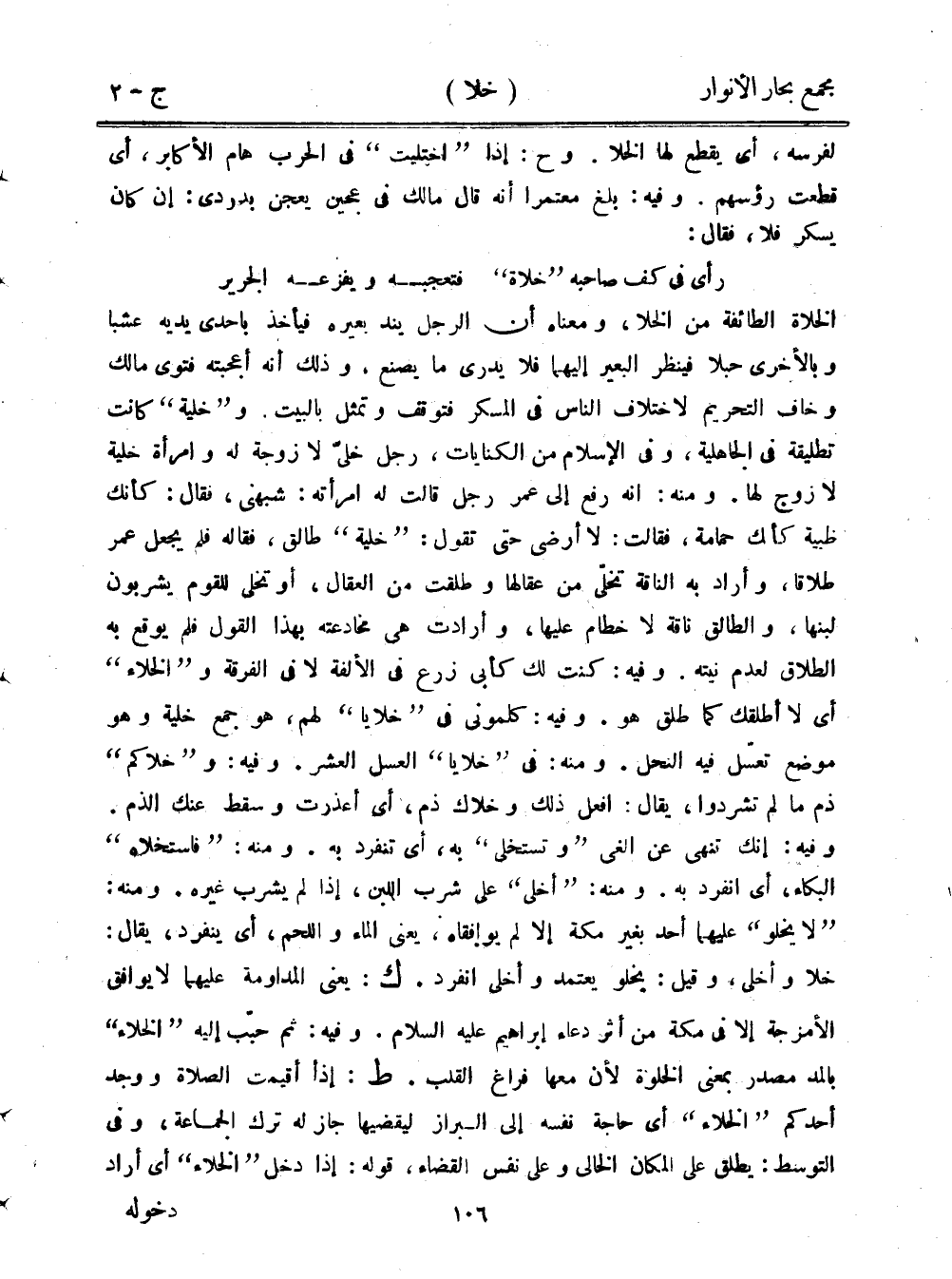 الخلاء الطائفة من الخلا، ومعناه أن الرجل يند بعيره فيأخذ بإحدى يديه عشبًا وبالأخرى حبلًا فينظر البعير إليهما فلا يدري ما يصنع. وذلك أنه أعجبته فتوى مالك وخاف التحريم لاختلاف الناس في المسكر فتوقف وتمثل بالبيت. و"خلية" كانت تطليقة في الجاهلية، وفي الإسلام من الكنايات، رجل خلىّ لا زوجة له وامرأة خلية لا زوج لها. ومنه: أنه رفع إلى عمر رجل قالت له امرأته: شبهني، فقال: كأنك ظبية كأنك حمامة، فقالت: لا أرضى حتى تقول: "خلية" طالق، فقاله فلم يجعل عمر طلاقًا، وأراد به الناقة تخلى من عقالها وطلقت من العقال، أو تخلى للقوم يشربون لبنها، والطالق ناقة لا خطام عليها، وأرادت هي مخادعته بهذا القول فلم يوقع به الطلاق لعدم نيته. وفيه: كنت لك كأبي زرع في الألفة لا في الفرقة و"الخلاء" أي لا أطلقك كما طلق هو. وفيه: كلموني في "خلايا" لهم، هو جمع خلية وهو موضع تعسل فيه النحل. ومنه: في "خلايا" العسل العشر. وفيه: و"خلاكم" ذم ما لم تشردوا، يقال: افعل ذلك وخلاك ذم، أي أعذرت وسقط عنك الذم. وفيه: إنك تنهي عن الغي "وتستخلي" به، أي تنفرد به. ومنه: "فاستخلاه" البكاء، أي انفرد به. ومنه: "أخلى" على شرب اللبن، إذا لم يشرب غيره. ومنه: "لا يخلو" عليهما أحد بغير مكة إلا لم يوافقاه، يعني الماء واللحم، أي ينفرد، يقال: خلا وأخلى، وقيل: يخلو يعتمد وأخلى انفرد. ك: يعني المداومة عليهما لا يوافق الأمزجة إلا في مكة من أثر دعاء إبراهيم عليه السلام. وفيه: ثم حبب إليه "الخلاء" بالمد مصدر بمعنى الخلوة لأن معها فراغ القلب. ط: إذا أقيمت الصلاة ووجد أحدكم "الخلاء" أي حاجة نفسه إلى البراز ليقضيها جاز له ترك الجماعة، وفي التوسط: يطلق على المكان الخالي وعلى نفس القضاء، قوله: إذا دخل "الخلاء" أي أراد
