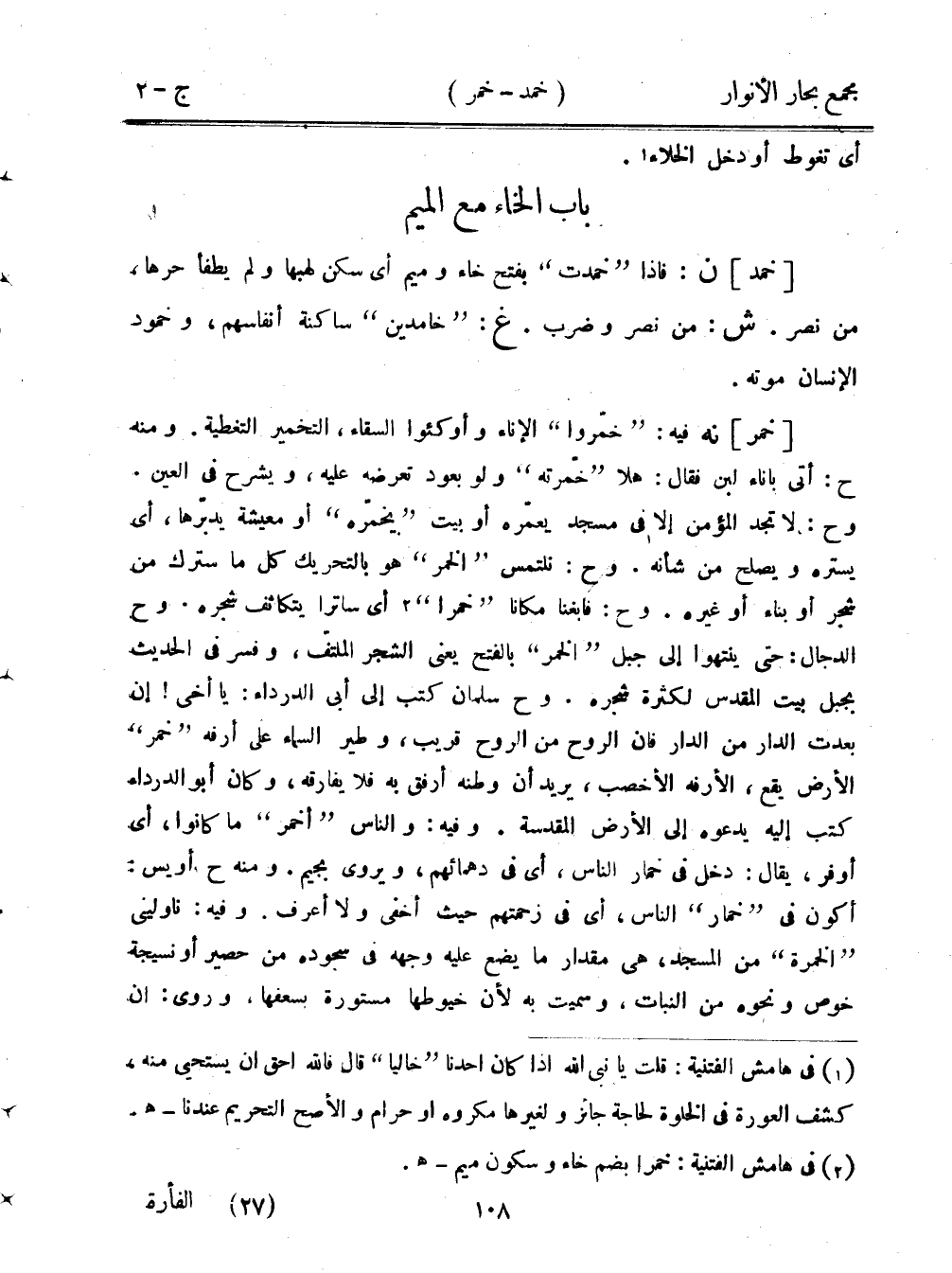 [خمر] نه فيه: "خمروا" الإناء وأوكئوا السقاء، التخمير التغطية. ومنه ح: أتى بإناء لبن فقال: هلا "خمرته" ولو بعود تعرضه عليه، ويشرح في العين. وح: لا تجد المؤمن إلا في مسجد يعمره أو بيت "يخمره" أو معيشة يدبرها، أي يستره ويصلح من شأنه. وح: تلتمس "الخمر" هو بالتحريك كل ما سترك من شجر أو بناء أو غيره. وح: فابغنا مكانا "خمرًا" أي ساترًا يتكاثف شجره. وح الدجال: حتى ينتهوا إلى جبل"الخمر" بالفتح يعني الشجر الملتف، وفسر في الحديث بجبل بيت المقدس لكثرة شجره. وح سلمان كتب إلى أبي الدرداء: يا أخي! إن بعدت الدار من الدار فإن الروح من الروح قريب، وطر السماء على أرفه "خمر" الأرض يقع، الأرفه الأخصب، يريد أن وطنه أرفق به فلا يفارقه، وكان أبو الدرداء كتب إليه يدعوه إلى الأرض المقدسة. وفيه: والناس "أخمر" ما كانوا، أي أوفر، يقال: دخل في خمار النس، أي في دهمائهم، ويروى بجيم. ومنه ح أويس: أكون في "خمار" الناس، أي في زحمتهم حيث أخفى ولا أعرف. وفيه: ناوليني "الخمرة" من المسجد، هي مقدار ما يضع عليه وجهه في سجوده من حصير أنسيجة خوص ونحوه من النبات، وسميت به لأن خيوطها مستورة بسعفها. وروى: أن