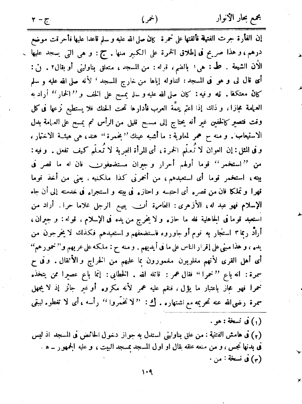 إن الفأرة جرت الفتيلة فألقتها على خمرة كان صلى الله عليه وسلم قاعدًا عليها فأحرقت موضع درهم، وهذا صريح في إطلاق الخمرة على الكبير منها. ج: وهي التي يسجد عليها الآن الشيعة. ط: هي بالضم، قوله: من المسجد، متعلق بناوليني أو بقال. ن: أي قال لي وهو في المسجد: لتناوله إياها من خارج المسجد، لأنه صلى الله عليه وسلم كان معتكفًا. نه وفيه: كان صلى الله عليه وسلم يمسح على الخف و"الخمار" أراد به العمامة مجازًا، وذلك إذا اعتم عمة العرب فأدارها تحت الحنك فلا يستطيع نزعها في كل وقت فتصير كالخفين غير أنه يحتاج إلى مسح قليل من الرأس ثم يمسح على العمامة بدل الاستيعاب. ومنه ح عمر لمعاوية: ما أشبه عينك "بخمرة" هند، هي هيئة الاختمار، وفي المثل: إن العوان لا تُعلم الخمرة، أي المرأة المجربة لا تُعلم كيف تفعل. وفيه: من "استخمر" قومًا أولهم أحرار وجيران مستضعفون فإن له ما قصر في بيته، استخمر قومًا أي استبعدهم، من أخمرني كذا ملكنيه، يعني من أخذ قومًا قهرًا وتملكًا فإن من قصره أي احتبسه واحتازه في بيته واستجراه في خدمته إلى أن جاء الإسلام فهو عبد له، الأزهري: المخامرة أن يبيع الرجل غلامًا حرا. أراد من استعبد قومًا في الجاهلية فله ما حازه ولا يخرج مني يده في الإسلام، قوله: وجيران، أراد ربما استجار به قوم أو جاوروه فاستضعفهم واستعبدهم فكذلك لا يخرجون من يده، وهذا مبني على إقارر الناس على ما في أيديهم. ومنه ح: ملكه على عربهم و"خمورهم" أي أهل القرى لأنهم مغلوبون مغمورون بما عليهم من الخارج والأثقال. وفي ح سمرة: أنه باع "خمرًا" فقال عمر: قاتله الله. الخطابي: إنما باع عصيرًا ممني تخذه خمرًا فهو مجز باعتبار ما يؤل، فنقم عليه عمر لأنه مكروه أو غير جائز إذ لا يجهل سمرة رضي الله عنه تحريمه مع اشتهاره. ك: "لا تخمروا" رأسه، أي لا تغطوه ليبقى