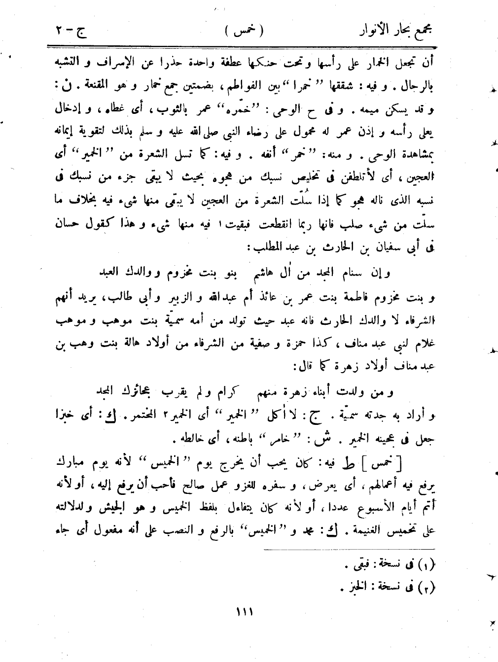 [خمس] ط فيه: كان يحب أن يخرج يوم "الخميس" لأنه يوم مبارك يرفع فيه أعمالهم، أي يعرضن وسفره للغزو عمل صالح فأحب أن يرفع إليه، أو لأنه أتم أيام الأسبوع عددًا، أو لأنه كان يتفاءل بلفظ الخميس وهو الجيش ولدلالته على تخميس الغنيمة. ك: محمد و"الخميس" بالرفع والنصب على أنه مفعول أي جاء