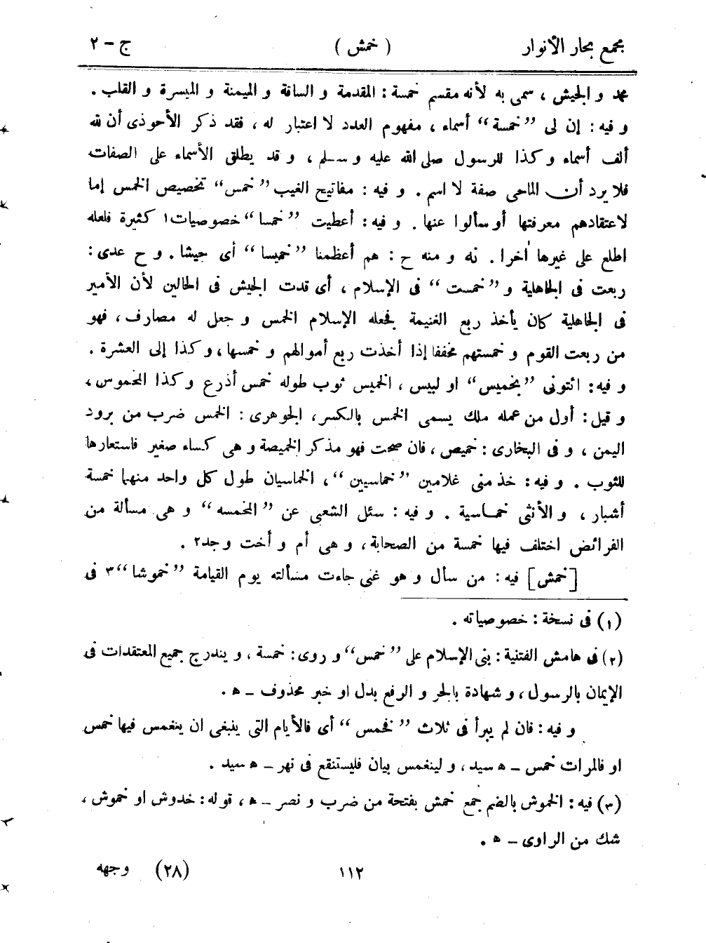 محمد والجيش، سمى به لأنه مقسم خمسة: المقدمة والساقة والميمنة والميسرة والقلب. وفيه: إن لي "خمسة" أسماء، مفهوم العدد لا اعتبار له، فقد ذكر الأحوذي أن لله ألف أسماء وكذا للرسول صلى الله عليه وسلم، وقد يطلق الأسماء على الصفات فلا يرد أن الماحي صفة لا اسم. وفيه: مفاتيح الغيب "خمس" تخصيص الخمس إما لاعتقادهم معرفتها أو سألوا عنها. وفيه: أعطيت "خمسًا" خصوصيات كثيرة فلعله اطلع على غيرها أخرا. نه ومنه ح: هم أعظمنا "خميسًا" أي جيشًا. وح عدى: ربعت في الجاهلية و"خمست" في الإسلام، أي قدت الجيش في الحالين لأن الأمير في الجاهلية كان يأخذ ربع الغنيمة فجعله الإسلام الخمس وجعل له مصارف، فهو من ربعت القوم وخمستهم مخففًا إذا أخذت ربع أموالهم وخمسها، وكذا إلى العشرة. وفيه: ائتوني "بخميس" أو لبيس، الخميس ثوب طوله خمس أذرع وكذا المخموس، وقيل: أول من عمله ملك يسمى الخمس بالكسر، الجوهري: الخمس ضرب من برود اليمن، وفي البخاري: خميص، فإن صحت فهو مذكر الخميصة وهي كساء صغير فاستعارها للثوب. وفيه: خذ مني غلامين "خماسين"، الخماسيان طول كل واحد منهما خمسة أشبار، والأنثى خماسية. وفيه: سئل الشعبي عن "المخمسه" وهي مسألة من الفرائض اختلف فيها خمسة من الصحابة، وهي أم وأخت وجد.