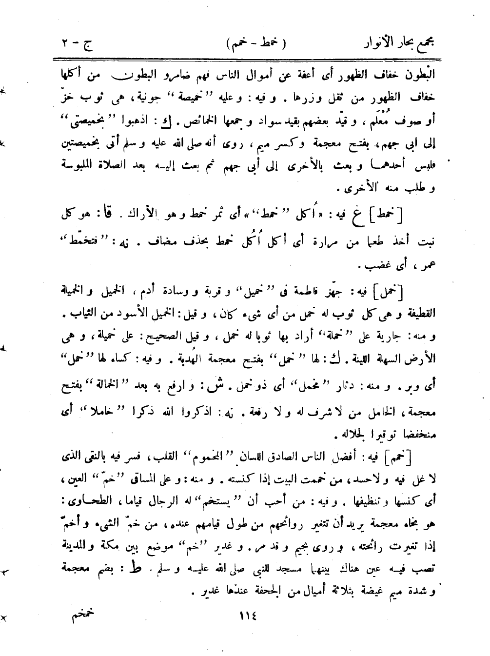[خمم] فيه: أفضل الناس الصادق اللسان "المخموم" القلب، فسر فيه بالنقي الذي لا غل فيه ولاحسد، من خممت البيت إذا كنسته. ومنه: وعلى المساقي "خم" العين، أي كنسها وتنظيفها. وفيه: من أحب أن "يستخم" له الرجال قيامًا، الطحاوي: هو بخاء معجمة يريد أن تتغير روائحهم من طول قيامهم عنده، من خم الشيء وأخم إذا تغيرت رائحته، وروى بجيم وقد مر. وغدير "خم" موضع بين مكة والمدينة تصب فيه عين هناك بينهما مسجد للنبي صلى الله عليه وسلم. ط: بضم معجمة وشدة ميم غيضة بثلاثة أميال من الجحفة عندها غدير.