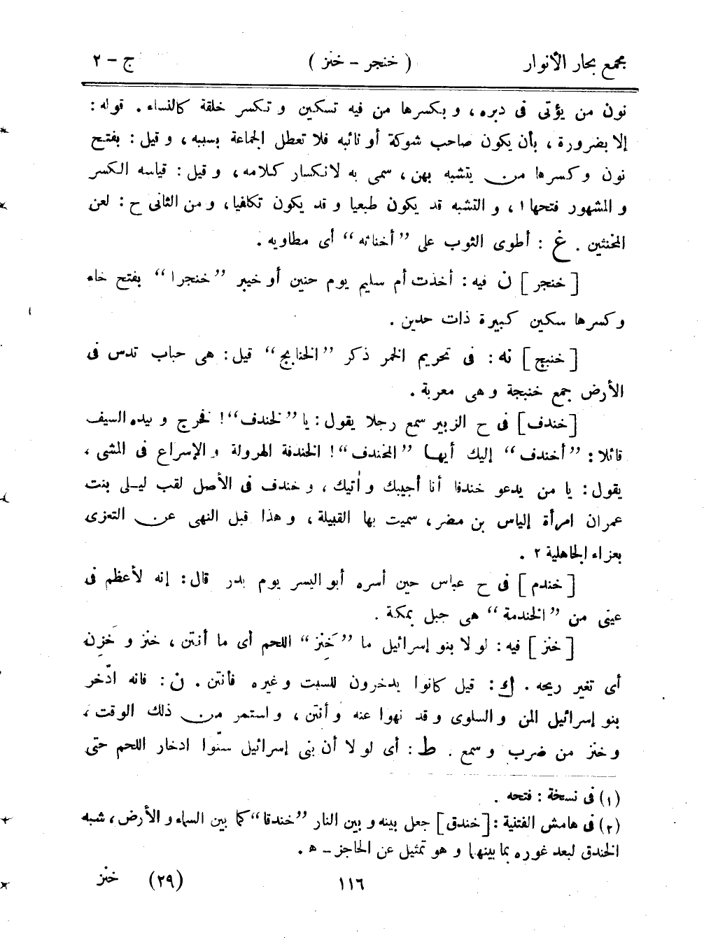 نون من يؤتي في دبره، وبكسرها من فيه تسكين وتكسر خلقة كالنساء. قوله: إلا بضرورة، بأن يكون صاحب شوكة أو نائبه فلا تعطل الجماعة بسببه، وقيل: بفتح نون وكسرها من يتشبه بهن، سمي به لانكسار كلامه، وقيل: قياسه الكسر والمشهور فتحها، والتشبه قد يكون طبعيًا وقد يكون تكليفًا، ومن الثاني ح: لعن المخنثين. غ: أطوى الثوب على "أخناثه" أي مطاويه. [خنجر] ن فيه: أخذت أم سليم يوم حنين أو خيبر "خنجرا" بفتح خاء وكسره سكين كبيرة ذات حدين.
