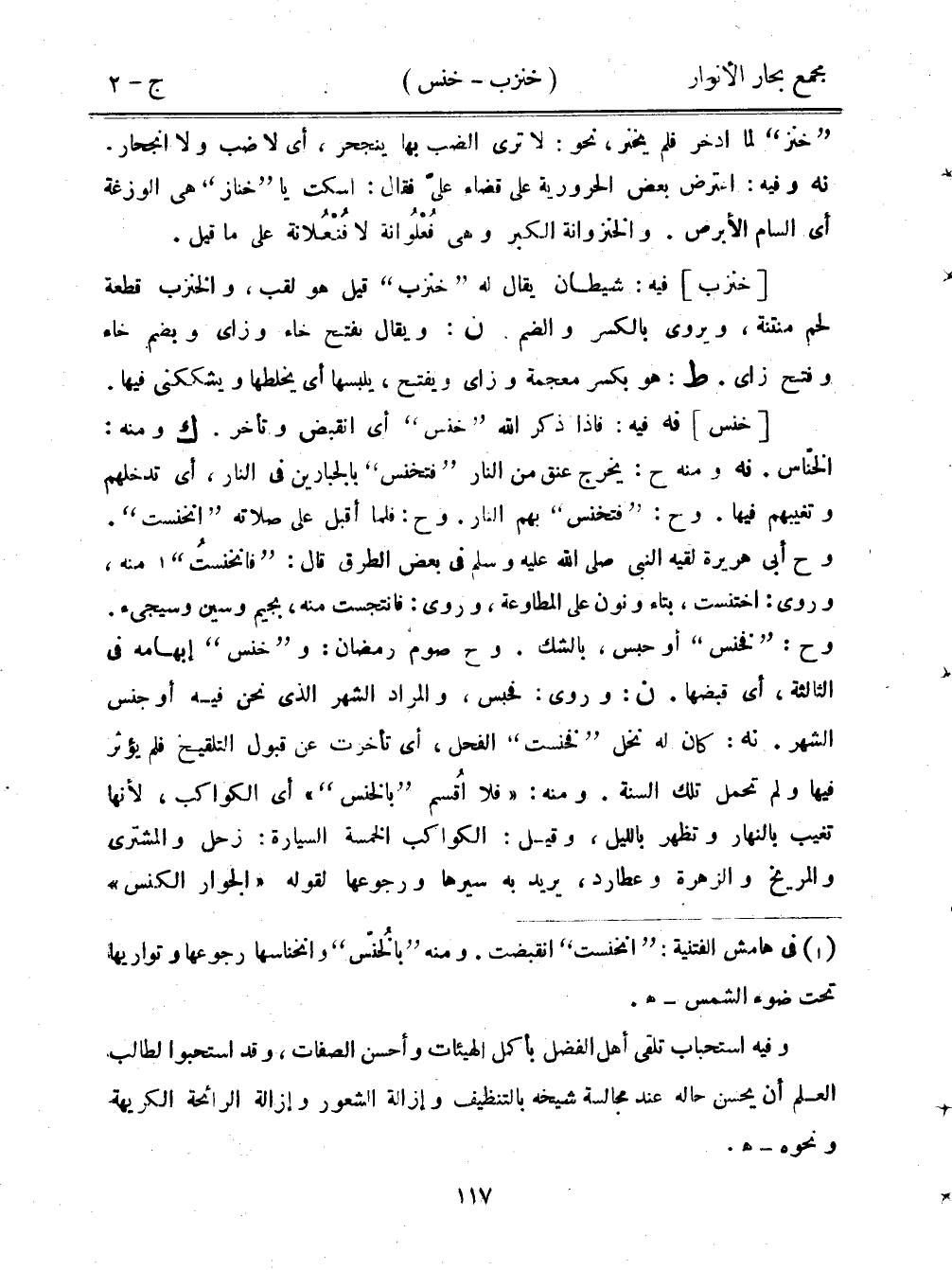 [خنس] فه فيه: فإذا ذكر الله "خنس" أي انقبض وتأخر. ك ومنه: الخناس. نه ومنه ح: يخرج عنق من النار "فتخنس" بالجبارين في النار، أي تدخلهم وتغيبهم فيها. وح: "فتخنس" بهم النار. وح: فلما أقبل على صلاته "انخنست". وح أبي هريرة لقيه النبي صلى الله عليه وسلم في بعض الطرق قال: "فانخنست" منه، وروى: اختنست، بتاء ونون على المطاوعة، وروى: فانتجست منه، بجيم وسين وسيجيء. وح: "فخنس" أو حبس، بالشك. وح صوم رمضان: و"خنس" إبهامه في الثالثة، أي قبضها. ن: وروى: فحبس، والمراد الشهر الذي نحن فيه أو جنس الشهر. نه: كان له نخل "فخنست" الفحل، أي تأخرت عن قبول التلقيح فلم يؤثر فيها ولم تحمل تلك السنة. ومنه: "فلا أقسم "بالخنس"" أي الكواكب، لأنها تغيب بالنهار وتظهر بالليل، وقيل: الكواكب الخمسة السيارة: زحل والمشترى والمريخ والزهرة وعطارد، يريد به سيرها ورجوعها لقوله "الجوار الكنس"