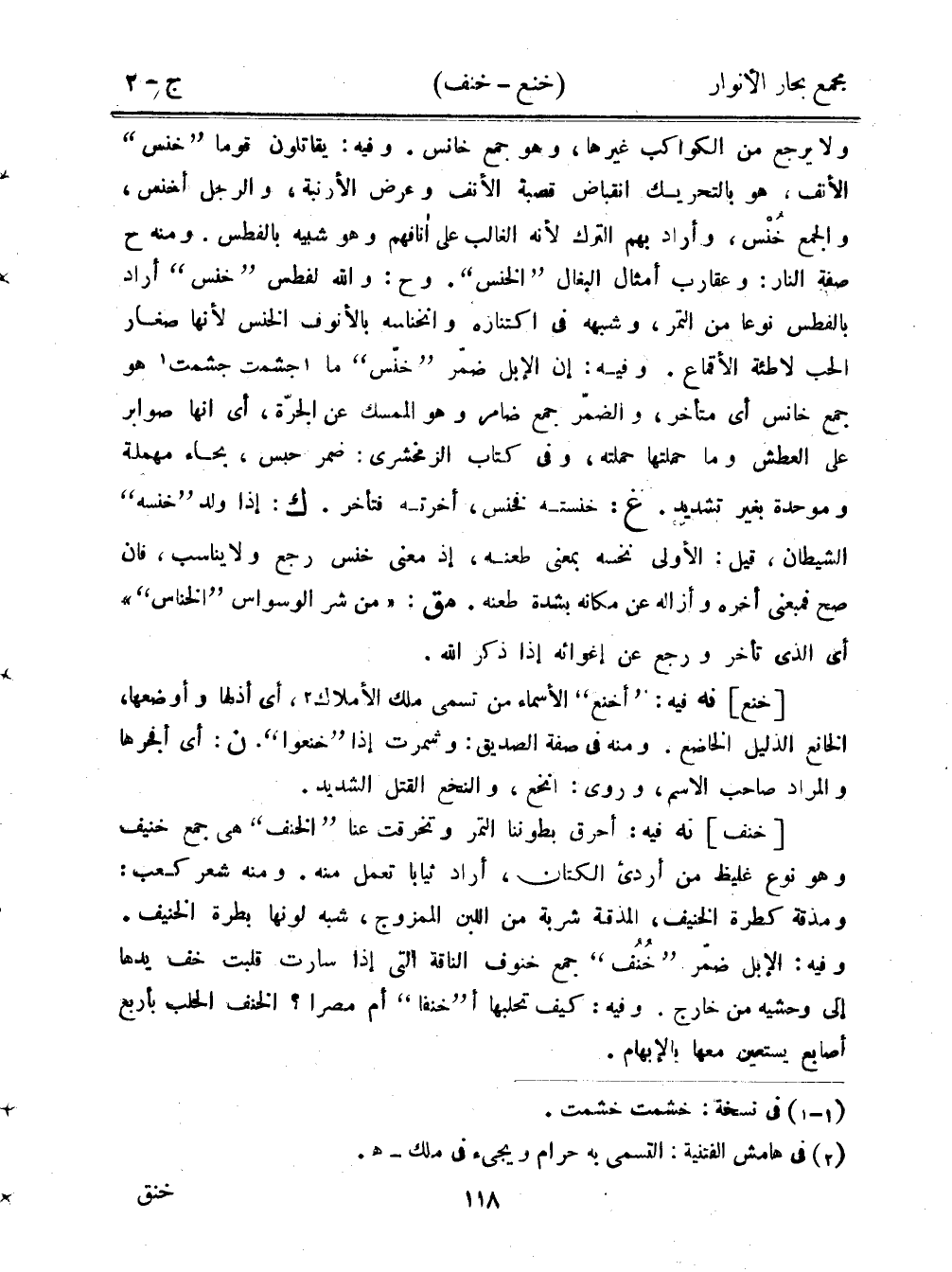ولا يرجع من الكواكب غيرها، وهو جمع خانس. وفيه: يقاتلون قومًا "خنس" الأنف، هو بالتحريك انقباض قصبة الأنف وعرض الأرنبة، والرجل أخنس، والجمع خُنس، وأراد بهم الترك لأنه الغالب على أنافهم وهو شبيه بالفطس. ومنه ح صفة النار: وعقارب أمثال البغال "الخنس". وح: والله لفطس "خنس" أراد بالفطس نوعًا من التمر، وشبهه في اتنازه وانخناسه بالأنوف الخنس لأنها صغار الحب لاطئة الأقماع. وفيه: إن الإبل ضمر "خنس" ما جشمت جشمت هو جمع خانس أي متأخر، والضمر جمع ضامر وهو الممسك عن الجرة، أي أنها صوابر على العطش وما حملتها حملته، وفي كتاب الزمخشري: ضمر حبسن بحاء مهملة وموحدة بغير تشديد. غ: خنسته فخنس، أخرته فتأخر. ك: إذا ولد "خنسه" الشيطان، قيل: الأولى نخسه بمعنى طعنه، إذ معنى خنس رجع ولا يناسب، فإن صح فبمعنى أخره وأزاله عن مكانه بشدة طعنه. مق: "من شر الوسواس "الخناس"" أي الذي تأخر ورجع عن إغوائه إذا ذكر الله.