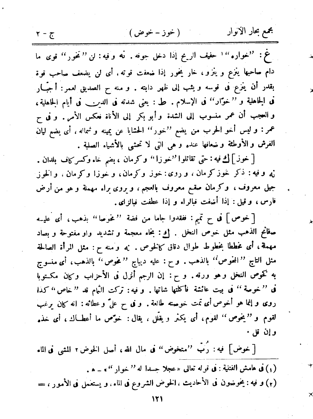 [خوز] ك فيه: حتى تقاتلوا "خوزا" وكرمان، بضم خاء وكسر كاف بلدان. نه وفيه: ذكر خوز كرمان، وروى: خوز وكرمان، وخوزا وكرمان، والخوز جبل معروف، وكرمان صقع معروف بالعجم، ويروى براء مهملة وهو من أرض فارس، وقيل: إذا أضفت فبالراء وإذا عطفت فبالزاي.