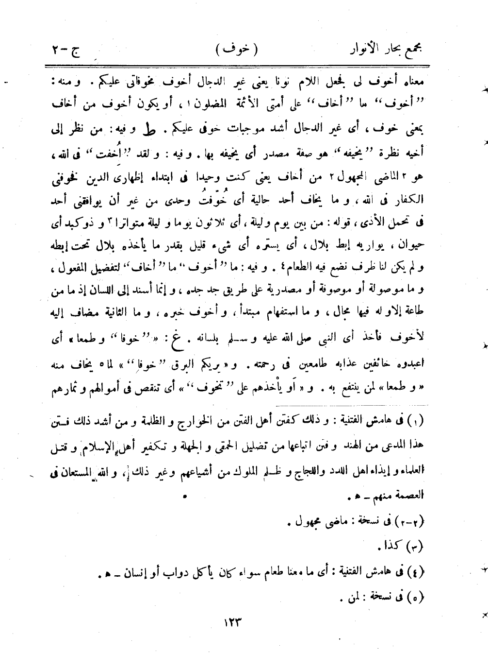 معناه أخوف لي فجعل اللام نونا يعني غير الدجال أخوف مخوفاتي عليكم. ومنه: "أخوف" ما "أخاف" على أمتي الأئمة المضلون، أو يكون أخوف من أخاف بمعنى خوف، أي غير الدجال أشد موجبات خوفي عليكم. ط وفيه: من نظر إلى أخيه نظرة "يخيفه" هو صفة مصدر أي يخيفه بها. وفيه: ولقد "اخفت" في الله، هو الماضي المجهول من أخاف يعني كنت وحيدًا في ابتداء إظهاري الدين فخوفني الكفار في الله، وماي خاف أحد حالية أي خوفت وحدى من غير أن يوافقني أحد في تحمل الأذى، قوله: من بين يوم وليلة، أي ثلاثون يومًا وليلة متواترًا وذو كبد أي حيوان، يواريه بط بلال، أي يستره أي شيء قليل بقدر ما يأخذه بلال تحت إبطه ولم يكن لنا ظرف نضع فيه الطعام. وفيه: ما "أخوف" ما "أخاف" لتفضيل المفعول، وما موصولة أو موصوفة أو مصدرية على طريق جد جده، وإنما أسند إلى اللسان إذ ما من طاعة إلا وله فيها مجال، وما استفهام مبتدأ، وأخوف خبره، وما الثانية مضاف إليه لأخوف فأخذ أي النبي صلى الله عليه وسلم بلسانه. غ: "خوفا" وطمعًا" أي اعبدوه خائفين عذابه طامعين في رحمته. "ويريكم البرق "خوفًا" لما يخاف منه "وطمعًا" لمن ينتفع به. و"او يأخذهم على "تخوف"" أي تنص في أموالهم وثمارهم