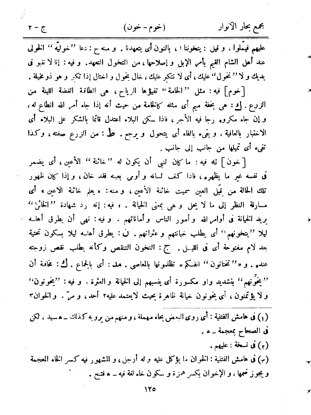 [خون] نه فيه: ما كان لنبي أن يكون له "خائنة" الأعين، أي يضمر في نفسه غير ما يظهره، فإذا كف لسانه وأومى بعينه فقد خان، وإذا كان ظهور تلك الحالة من قبل العين سميت خائنة الأعين، ومنه: "يعلم خائنة الأعين" أي مسارقة النظر إلى ما لا يحل وهي بمعنى الخيانة. وفيه: إنه رد شهادة "الخائن" يريد الخيانة في أوامر الله وأمور الناس وأماناتهم. وفيه: نهى أن يطرق أهله ليلًا "يتخونهم" أي يطلب خيانتهم وعثراتهم. ن: يطرق أهله ليلًا بسكون تحتية بعد لام مفتوحة أي في الليل. ج: التخون التنقص وكأنه يطلب نقص زوجته عنده. "وتختانون" أنفسكم" تظلمونها بالمعاصي. مد: أي بالجماع. ك: مخافة أن "يخونهم" بتشديد واو مكسورة أي ينسبهم إلى الخيانة والعثرة. وفيه: "يخونون" ولا يؤتمنون، أي يخونون خيانة ظاهرة بحيث لا يعتمد عليه أحد، ومر. والخوان