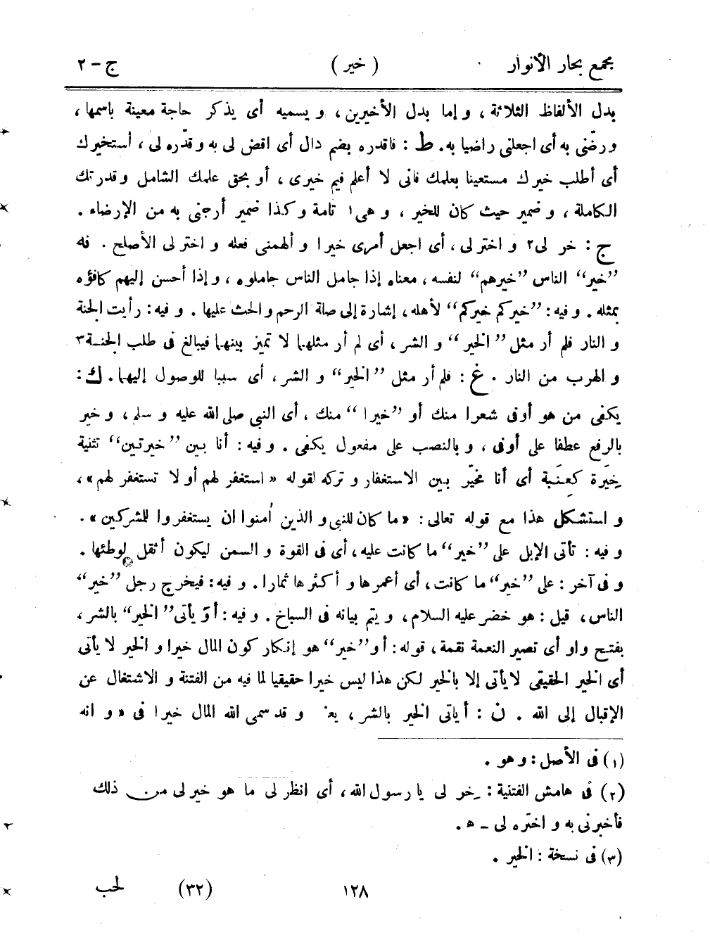 بدل الألفاظ الثلاثة، وإما بدل الأخيرين، ويسميه أي يذكر حاجة معينة باسمها، ورضي به أي اجعلني راضيًا به. ط: فاقدره بضم دال أي اقض لي به وقدره لي، استخيرك أي أطلب خيرك مستعينًا بعلمك فإني لا أعلم فيم خيري، أو بحق علمك الشامل وقدرتك الاملة، وضمير حيث كان للخير، وهي تامة وكذا ضمير أرجعني به من الإرضاء. ج: خر لي واختر لي، أي اجعل أمري خيرًا وألهمني فعله واختر لي الأصلح. نه "خير" الناس "خيرهم" لنفسه، معناه إذا جامل الناس جاملوه، وإذا أحسن إليهم كافؤه بمثله. وفيه: "خيركم خيركم" لأهله، إشارة إلى صلة الرحم والحث عليها. وفيه: رأيت الجنة والنار فلم أر مثل "الخير" والشر، أي لم أر مثلهما لا تميز بينهما فيبالغ في طلب الجنة والهرب من النار. غ: فلم أر مثل "الخير" والشر، أي سببًا للوصول إليهما. ك: يكفي من هو أوفى شعرًا منك أو "خيرًا" منك، أي النبي صلى الله عليه وسلم، وخير بالرفع عطفًا على أوفى، وبالنصب على مفعول يكفي. وفيه: أنا بين "خيرتين" تثنية خيرة كعنبة أي أنا مخير بين الاستغفار وتركه لقوله "استغفر لهم أو لا تستغفر لهم". واستشكل هذا مع قوله تعالى: "ما كان للنبي والذين أمنوا أن يستغفروا للمشركين". وفيه: تأتي الإبل على "خير" ما كانت عليه، أي في القوة والسمن ليكون أثقل لوطئها. وفي آخر: على "خير" ما كانت، أي أعمرها وأكثرها ثمارًا. وفيه: فيخرج رجل "خير" الناس، قيل: هو خضر عليه السلام، ويتم بيانه في السباخ. وفيه: أو يأتي "الخير" بالشر، بفتح واو أي تصير النعمة نقمة، قوله: أو "خير" هو إنكار كون المال خيرًا والخير لا يأتي أي الخير الحقيقي لا يأتي إلا بالخير لكن هذا ليس خيرًا حقيقيًا لما فيه من الفتنة والاشتغال عن الإقبال إلى الله. ن: أيأتي الخير بالشر، يعني وقد سمى الله المال خيرًا في "وأنه