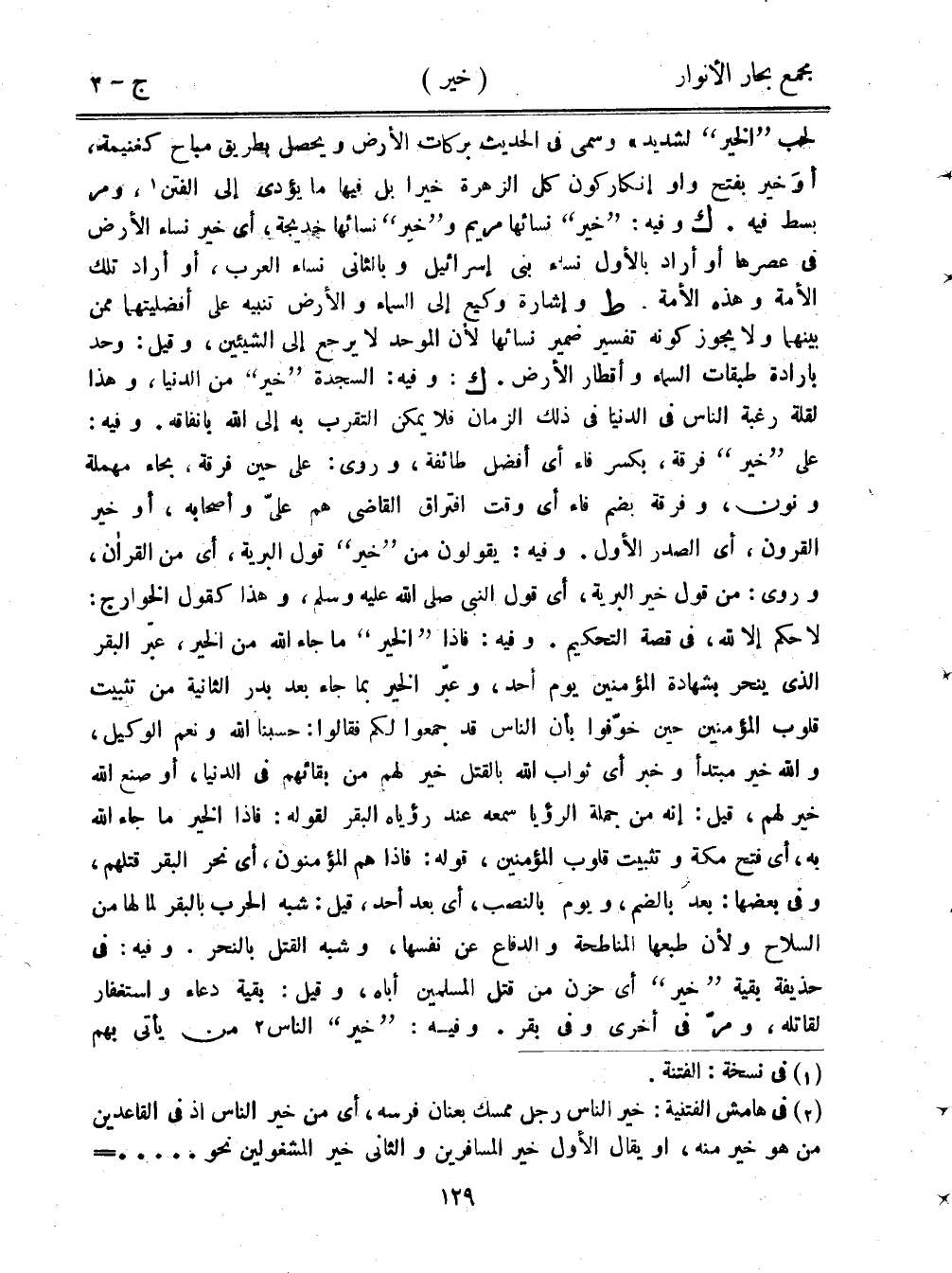 لحب "الخير" لشديد" وسمي في الحديث بركات الأرض ويحصل بطريق مباح كغنيمة، أو خير بفتح واو إنكار كون كل الزهرة خيرًا بل فيها ما يؤدي إلى الفتن، ومر بسط فيه. ك وفيه: "خير" نسائها مريم و"خير" نسائها خديجة، أي خير نساء الأرض في عصرها أو أراد بالأول نساء بني إسرائيل وبالثاني نساء العرب، أو أراد تلك الأمة وهذه الأمة. ط وإشارة وكيع إلى السماء والأرض تنبيه على أفضليتهما ممن بينهما ولا يجوز كونه تفسير ضمير نسائها لأن الموحد لا يرجع إلى الشيئين، وقيل: وحد بإرادة طبقات السماء وأقطار الأرض. ك: وفيه: السجدة "خير" من الدنيا، وهذا لقلة رغبة الناس في الدنيا في ذلك الزمان فلا يمكن التقرب به إلى الله بإنفاقه. وفيه: على "خير" فرقة، بكسر فاء أي أفضل طائفة، وروى: على حين فرقة، بحاء مهملة ونون، وفرقة بضم فاء أي وقت افتراق القاضي هم عليّ وأصحابه، أو خير القرون، أي الصدر الأول. وفيه: يقولون من "خير" قول البرية، أي من القرآن، وروى: من قول خير البرية، أي قول النبي صلى الله عليه وسلم، وهذا كقول الخوارج: لا حكم إلا لله، في قصة التحكيم. وفيه: فإذا "الخير" ما جاء الله من الخير، عبر البقر الذي ينحر بشهادة المؤمنين يوم أحد، وعبر الخير بما جاء بعد بدر الثانية من تثبيت قلوب المؤمنين حين خوفوا بأن الناس قد جمعوا لكم فقالوا: حسبنا الله ونعم الوكيل، والله خبر مبتدأ وخبر أي ثواب الله بالقتل خير لهم من بقائهم في الدنيا، أو صنع الله خير لهم، قيل: إنه من جملة الرؤيا سمعه عند رياه البقر لقوله: فإذا الخير ما جاء الله به، أي فتح مكة وتثبيت قلوب المؤمنين، قوله: فإذا هم المؤمنون، أي نحر البقر قتلهم، وفي بعضها: بعد بالضم، ويوم بالنصب، أي بعد أحد، قيل: شبه الحرب بالبقر لما لها من السلاح ولأن طبعها المناطحة والدفاع عن نفسها، وشبه القتل بالنحر. وفيه: في حذيفة بقية "خير" أي حزن من قتل المسلمين أباه، وقيل: بقية دعاء واستغفار لقاتله، ومر في أخرى وفي بقر. وفيه: "خير" الناس من يأتي بهم