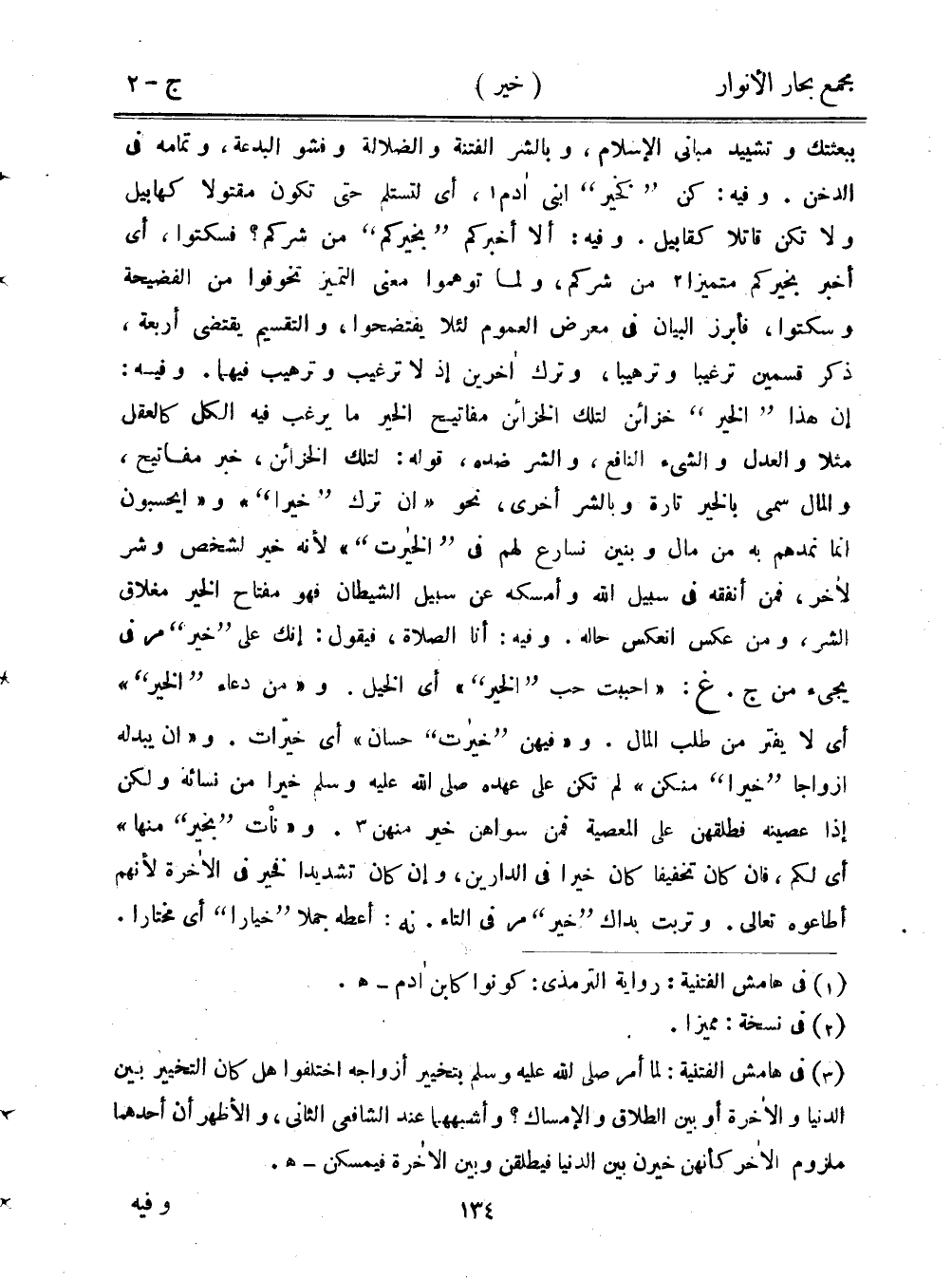 ببعثتك وتشييد مباني الإسلام، وبالشر الفتنة والضلالة وفشو البدعة، وتمامه في الدخن. وفيه: كن "كخير" ابني ادم، أي لتستلم حتى تكون مقتولًا كهابيل ولا تكن قاتلًا كقابيل. وفيه: ألا أخبركم "بخيركم" من شركم؟ فستوا، أي أخبر بخيركم متميزا من شركم، ولما توهموا معنى التميز تخوفوا من الفضيحة وسكتوا، فأبرز البيان في معرض العموم لئلا يفتضحوا، والتقسيم يقتضي أربعة، ذكر قسمين ترغيبًا وترهيبًان وترك آخرين غذ لا ترغيب وترهيب فيهما. وفيه: إن هذا "الخير" خزائن لتلك الخزائن مفاتيح الخير ما يرغب فيه الكل العقل مثلًا والعدل والشيء النافع، والشر ضده، قوله: لتلك الخزائن، خبر مفاتيح، والمال سمي بالخير تارة وبالشر أخرى، نحو "أن ترك "خيرًا"" و"ايحسبون إنما نمدهم به منمال وبنين نسارع لهم في "الخيرت"" لأنه خير لشخص وشر لآخر، فمن أنفقه في سبيل الله وأمسكه عن سبيل الشيطان فهو مفتاح الخير مغلاق الشر، ومن عكس انعكس حاله. وفيه: أنا الصلاة، فيقول: إنك على "خير" مر في يجيء من ج. غ: "احببت حب "الخير"" أي الخيل. و"من دعاء "الخير"" أي لا يفتر من طلب المال. و"فيهن "خيرت" حسان" أي خيرات. و"أن يبدله أزواجًا "خيارً" منكن" لم تكن على عهده صلى الله عليه وسلم خيارً من نسائه ولكن إذا عصيته فطلقهن على المعصية فمن سواهن خير منهن. و"نأت "بخير" منها" أي لكم، فإن كان تخفيفًا كان خيرًا في الدارين، وإن كان تشديدًا فخير في الآخرة لأنهم أطاعوه تعالى. وترتب يداك "خير" مر في التاء. نه: أعطه جملًا "خيارًا" أي مختارًا.