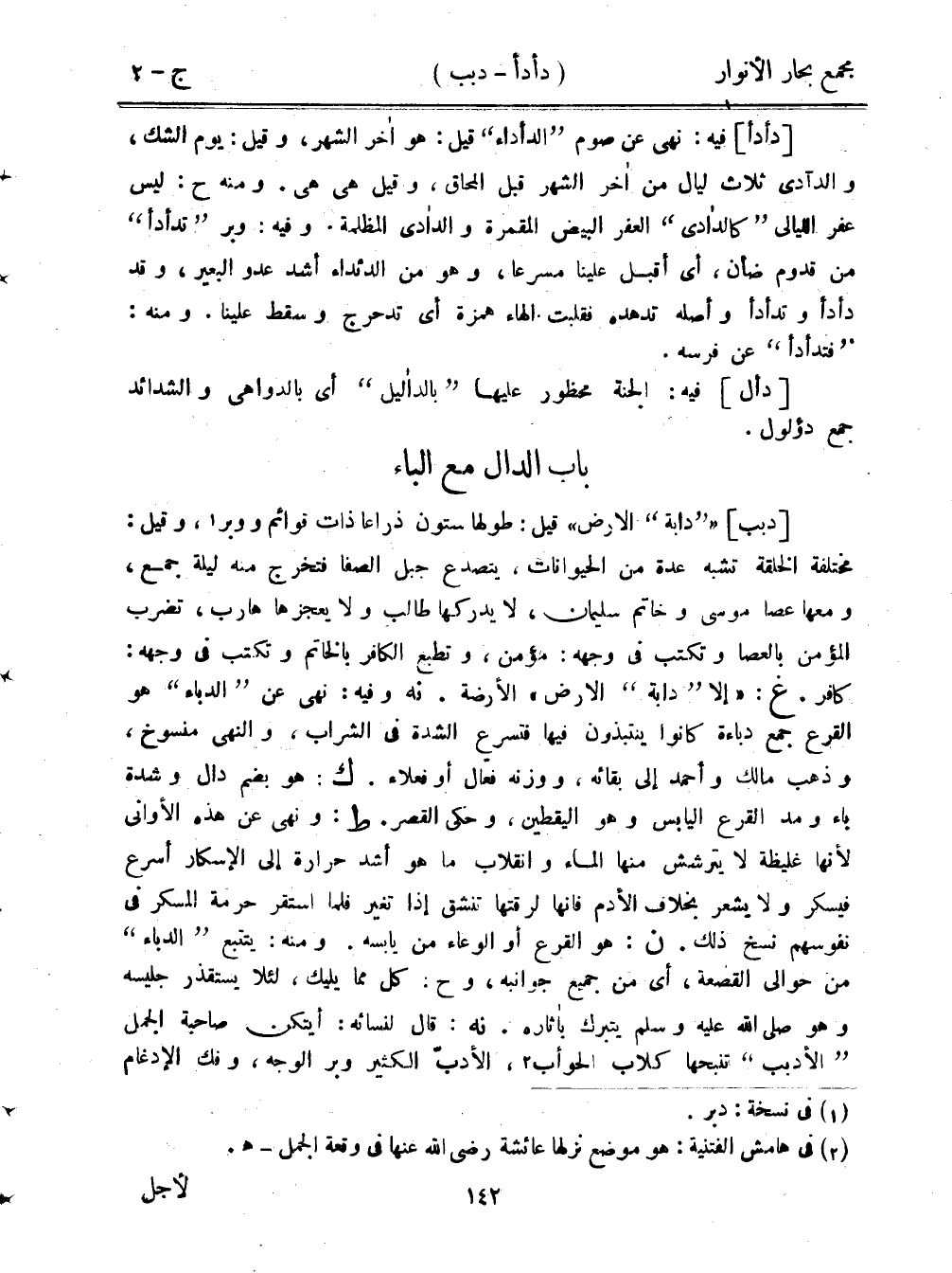[دبب] ""دابة" الأرض" قيل: طولها ستون ذراعًا ذات قوائم ووبرا، وقيل: مختلفة الخلقة تشبه عدة من الحيوانات، يتصدع جبل الصفا فتخرج منه ليلة جمع، ومعها عصا موسى وخاتم سليمان، لايدركها طالب ولا يعجزها هارب، تضرب المؤمن بالعصا وتكتب في وجهه: مؤمن، وتطبع الكافر بالخاتم وتكتب في وجهه: كافر. غ: "إلا "دابة" الأرض" الأرضة. نه وفيه: نهى عن "الدباء" هو القرع جمع دباءة كانوا ينتبذون فيها فتسرع الشدة في الشراب، والنهي منسوخ، وذهب مالك وأحمد إلى بقائه، ووزنه فعال أو فعلاء. ك: هو بضم دال وشدة باء ومد القرع اليابس وهو اليقطين، وحكى القصر. ط: ونهى عن هذه الأواني لأنها غليظة لا يترشش منها الماء وانقلاب ما هو أشد حرارة إلى الإسكار أسرع فيسكر ولا يشعر بخلاف الدم فإنها لرقتها تنشق إذا تغير فلما استقر حرمة المسكر في نفوسهم نسخ ذلك. ن: هو القرع أو الوعاء من يابسه. ومنه: يتتبع "الدباء" من حوالي القصعة، أي من جميع جوانبه، وح: كل مما يليك، لئلا يستقذر جليسه وهو صلى الله عليه وسلم يتبرك بأثاره. نه: قال لنسائه: أيتكن صاحبة الجمل "الأديب" تنبحها كلاب الحوأب، الأدب الكثير وبر الوجه، وفك الإدغام