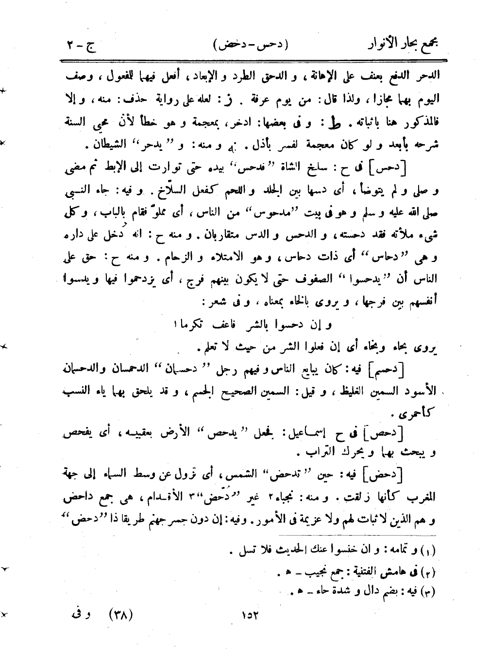[دحس] في ح: سلخ الشاة "فدحس" بيده حتى توارت إلى الإبط ثم مضى وصلى ولم يتوضأ، أي دسها بين الجلد واللحم كفعل السلاخ. وفيه: جاء النبي صلى الله لعيه وسلم وهو في بيت "مدحوس" من الناس، أي مملو فقام بالباب، وكل شيء ملأته فقد دحسته، والدحس والدس متقاربان. ومنه ح: أنه دخل على داره وهي "دحاس" أي ذات دحاس، وهو الامتلاء والزحام. ومنه ح: أنه دخل على داره وهي "دحاس" أي ذات دحاس، وهو الامتلاء والزحام. ومنه ح: حق على الناس أن "يدحسوا" الصفوف حتى لا يكون بينهم فرج، أي يزدحموا فيها ويدسوا أنفسهم بين فرجها، ويروى بالخاء بمعناه، وفي شعر:
