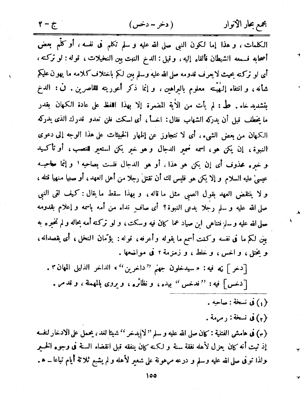الكلمات، وهذا إما لكون النبي صلى الله عليه وسلم تكلم في نفسه، أو كلم بعض أصحابه فسمعه الشيطان فألقاه إليه، وقيل: الدخ النبت بين النخيلات، قوله: لو تركته، أي لو تركته بحيث لا يعرف قدومه صلى الله عليه وسلم بين لكم باختلاف كلامه ما يهون عليكم شأنه، وانتفاء إلاهيته معلوم بالبراهين، وإنما ذكر أعوريته للقاصرين. ن: الدخ بتشديد خاء. ط: لم يأت من الآية المضمرة إلا بهذا اللفظ على عادة الكهان بقدر ما يخطف قبل أن يدركه الشهاب فقال: اخسأ، أي اسكت فلن تعدو قدرك الذي يدركه الكهان من بعض الشيء، أي لا تتجاوز عن إظهار الخبيئات على هذا الوجه إلى دعوى النبوة، إن يكن هو، اسمه ضمير الدجال وهو خبر يكن استعير للنصب، أو تأكيد وخبره محذوف أي إن يكن هو هذا، أو هو الدجال فلست بصاحبه وإنما صاحبه عيسى عليه السلام وألا يكن هو فليس لك أن تقتل رجلًا من أهل الهد، أو صبيًا منهيًا قتله، ولا ينتقض العهد بقول الصبي مثل ما قاله، وبهذا سقط ما يقال: كيف لقي النبي صلى الله عليه وسلم رجلًا يدعى النبوة؟ أي صاف نداء من أمه باسمه وإعلام بقدومه صلى الله لعيه وسلم فتناهى ابن صياد عما كان فيه وسكت، ولو تركته أمه بحاله ولم تخبره به بين لكم ما في نفسه وكنت أسمع ما يقوله وأعرفه، قوله: يؤمان النخل، أي يقصدانه، ويختل، واخس، وخلط، وزمزمة في مواضعها.