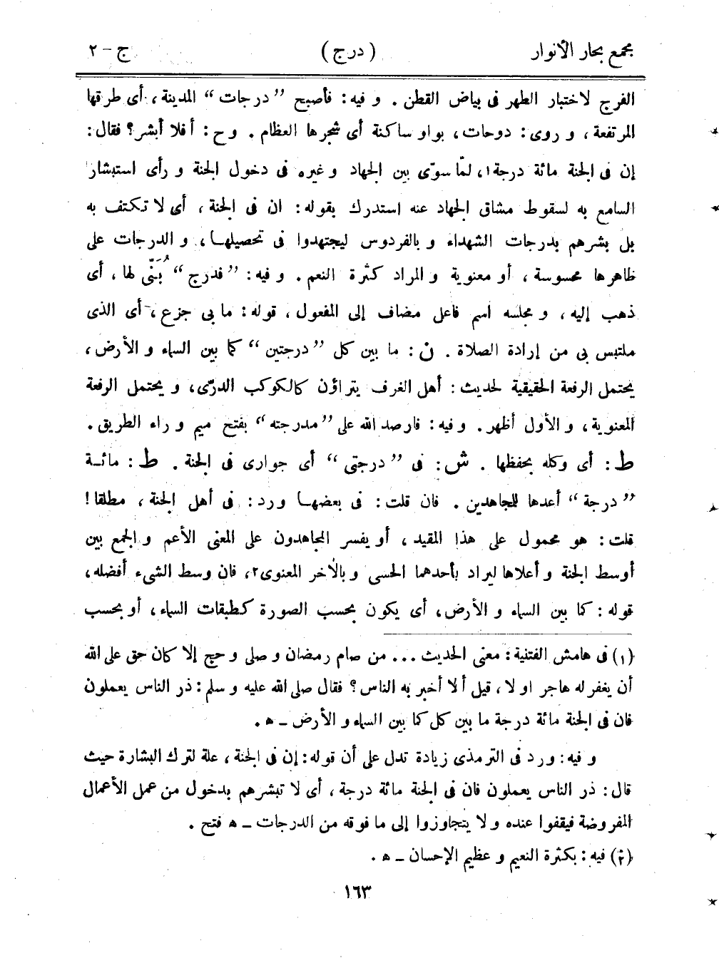 الفرج لاختبار الطهر في بياض القطن. وفيه: فأصبح "درجات" المدينة، أي طرقها المرتفعة، وروى: دوحات، بواو ساكنة أي شجرها العظام. وح: أفلا أبشر؟ فقال: إن في الجنة مائة درجة، لما سوى بين الجهاد وغيره في دخول الجنة ورأى استبشار السامعبه لسقوط مشاق الجهاد عنه استدرك بقوله: أن في الجنة، أي لا تكتف به بل بشرهم بدرجات الشهداء وبالفردوس ليجتهدوا في تحصيلها، والدرجات على ظاهرها محسوسة، أو معنوية والمراد كثرة النعم. وفيه: "فدرج" بُني لها، أي ذهب إليه، ومجلسه اسم فاعل مضاف إلى المفعول، قوله: ما بين جزع، أي الذي ملتبس بي من إرادة الصلاة. ن: ما بين كل "درجتين" كما بين السماء والأرض، يحتمل الرفعة الحقيقية لحديث: أهل الغرف يتراءون كالكوكب الدري، ويحتمل الرفعة المعنوية، والأول أظهر. وفيه: فارصد الله على "مدرجته" بفتح ميم وراء الطريق. ط: أي وكله بحفظها. ش: في "درجتي" أي جواري في الجنة. ط: مائة "درجة" أعدها للمجاهدين. فإن قلت: في بعضها ورد: في أهل الجنة، مطلقًا! قلت: هو محمول على هذا المقيد، أو يفسر المجاهدون على المعنى الأعم والجمع بين أوسط الجنة وأعلاها ليراد بأحدهما الحسي وبالآخر المعنوي، فإن وسط الشيء أفضله، قوله: كما بين السماء والأرض، أي يكون بحسب الصورة كطبقات السماء، أو بحسب