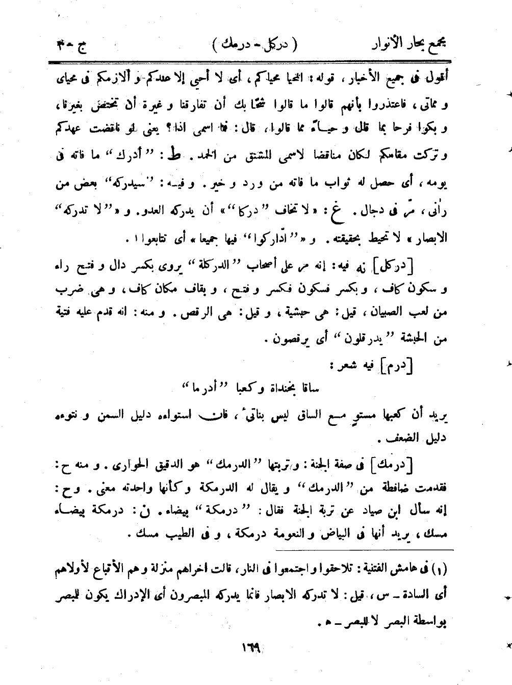 أقول في جميع الأخبار، قوله: المحيا محياكم، أي لا أحيي إلا عندكم وألازمكم في محياي ومماتي، فاعتذروا بأنهم قالوا ما قالوا شحا بك أن تفارقنا وغيرة أن تختص بغيرنا، وبكوا فرحًا بما قال وحياء مما قالوا، قال: فما اسمي إذًا؟ يعني لو ناقضت عهدكم وتركت مقامكم لكان مناقضًا لاسمي المشتق من الحمد. ط: "أدرك" ما فاته في يومه، أي حصل له ثواب ما فاته من ورد وخير. وفيه: "سيدركه" بعض من رأني، مر في دجال. غ: "لا تخاف" "دركا" أن يدركه العدو. و""لا تدركه" الأبصار" لا تحيط بحقيقته. و"اداركوا" فيها جميعًا" أي تتابعوا.