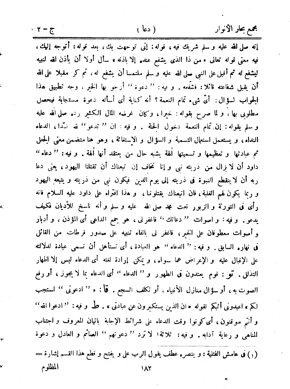 إنه صلى الله عليه وسلم شريك فيه، قوله: إني توجهت بك، بعد قوله: أتوجه غليك، فيه معنى قوله تعالى "من ذا الذي يشفع عنده إلا بإذنه" سأل أولًا أن يأذن الله لنبيه ليشفع له ثم أبل على النبي صلى الله عليه وسلم ملتمسًا أن يشفع له، ثم كر مقبلًا على الله أن يقبل شفاعته قائلًا: فشفعه. وفيه: "دعوة" أرجو بها الخير، وجه تطبيق هذا الجواب لسؤال: أي شيء تمام النعمة أنه كناية أي أسأله دعوة مستجابة فيحصل مطلوبي بها، ولما صرح بقوله: خيرًا، وكان غرضه المال الكثير رده صلى الله عليه وسلم بقوله: إن تمام النعمة دخول الجنة. وفيه: أن "تدعو" لله ندا، الدعاء النداء، ويستعمل استعمال التسمية والسؤال والاستغاثة، وهو هنا متضمن معنى الجعل ثم عبادتها وتعظيمها وتسميتها آلهة يشبه حال من يعتقد أنها آلهة. وفيه: "دعاء" داود أن لا يزال من ذريته نبي وإنا نخاف إن تبعناك أن تقتلنا اليهود، يعني دعا ربه أن لا ينقطع النبوة في ذريته إلى يوم الدين فيكون نبي من ذريته ويتبعه اليهود وربما يكون لهم الغلبة، فإن اتبعناك يقتلوننا، وهذا افتراء على داود عليه السلام فإنه رأى في التوراة والزبور نعت محمد صلى الله عليه وسلم وأنه ناسخ للأديان فكيف يدعو. وفيه: وأصوات "دعاتك" فاغفر لي، هو جمع الداعي أي المؤذن، وأدبار وأصوات معطوفان على الخبر، فاغفر لي بالفاء تنبيه على صدور فرطات من القائل في نهاره السابق. وفيه: "الدعاء" هو العبادة، أي تستأهل أن تسمى عبادة لدلالته على الإقبال عليه والإعراض عما سواه، ويمكن رادة لغته أي الدعاء ليس إلا إظهار التذلل. تو: قوم يعتدون في الطهور و"الدعاء" أي الدعاء بما لا يجوز، أو رفع الصوت به، أو سؤال منازل الأنبياء، أو تكلف السجع. قا: "ادعوني" استجب لكم" اعبدوني أثبكم لقوله "إن الذين يستكبرون عن عبادتي". ط وفيه: "ادعوا الله" وأنتم موقنون، أي كونوا وقت الدعاء على شرائط الإجابة بإتيان المعروف واجتناب المناهي ورعاية آدابه. وفيه: ثلاثة لا ترد "دعوتهم" الصائم والعادل ودعوة