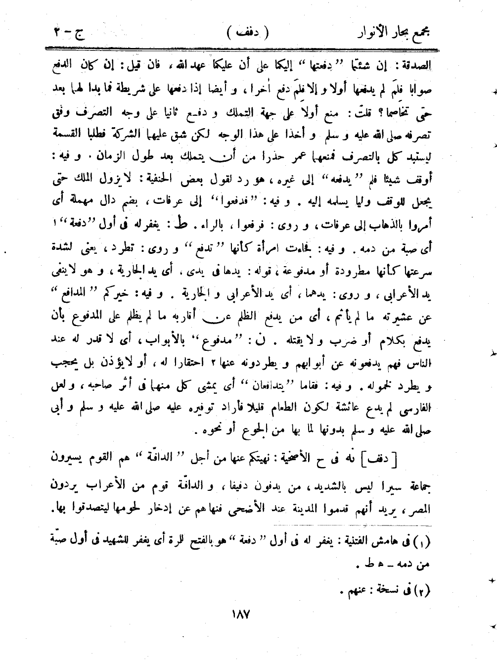 الصدقة: إن شئتما "دفعتها" إليكما على أن عليكما عهد الله، فإن قيل: إن كان الدفع صوابًا فلم لم يدفعها أولًا وألا فلم دفع أخرا، وأيضًا إذا دفعها على شريطة فما بدا لهما بعد حتى تخاصما؟ قلت: منع أولًا على جهة التملك ودفع ثانيًا على وجه التصرف وفق تصرفه صلى الله عليه وسلم وأخذا على هذا الوجه لكن شق عليهما الشركة فطلبا القسمة ليستبد كل بالتصرف فمنعهما عمر حذرا من أن يتملك بعد طول الزمان. وفيه: أوقف شيئًا فلم "يدفعه" إلى غيره، هو رد لقول بعض الحنفية: لا يزول الملك حتى يجعل للوقف وليًا يسلمه إليه. وفيه: "فدفعوا" إلى عرفات، بضم دال مهملة أي أمروا بالذهاب إلى عرفات، وروى: فرفعوا، بالراء. ط: يغفر له في أول "دفعة" أي صبة من دمه. وفيه: فجاءت امرأة كأنها "تدفع" وروى: تطرد، يعني لشدة سرعتها كأنها مطرودة أو مدفوعة، قوله: يدها في يدي، أي يد الجارية، وهو لا ينفي يد الأعرابي، وروى: يدهما، أي يد الأعرابي والجارية. وفيه: خيركم "المدافع" عن عشيرته ما لم يأثم، أي من يدفع الظلم عن أقاربه ما لم يظلم على المدفوع بأن يدفع بكلام أو ضرب ولا يقتله. ن: "مدفوع" بالأبواب، أي لا قدر له عند الناس فهم يدفعونه عن أبوابهم ويطردونه عنها احتقارًا له، أو لا يؤذن بل يحجب ويطرد لخموله. وفيه: فقاما "يتدافعان" أي يمشي كل منهما في أثر صاحبه، ولعل الفارسي لم يدع عائشة لكون الطعام قليلًا فأراد توفيره عليه صلى الله عليه وسلم وأبي صلى الله عليه وسلم بدونها لما بها من الجوع أو نحوه.