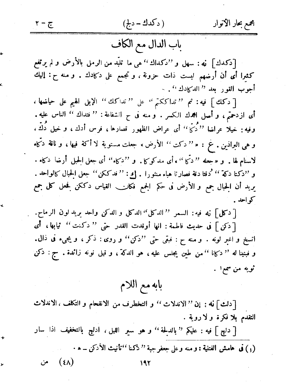 [دكك] فيه: ثم "تداككتم" على "تداكك" الإبل الهيم على حياضها، أي ازدحمتم، وأصل الدك الكسر. ومنه في ح الشفاعة: "فتداك" الناس عليه. وفيه: خيلا عراضًا "دكا" أي عراض الهور قصارها، فرس أدك، وخيل دُك، وهي البراذين. غ: ""دكت" الأرض" جعلت مستوية لا أكمة فيها، وناقة دكاء لا سنام لها. و"جعله "دكا"" أي مدكوكا. و"دكاء" أي جعل الجبل أرضًا دكاء. و"دكتادكة"دقتا دقة فصارتا هباء منثورًا. ك: "فدككن" جعل الجبال كالواحد. يريد أن الجبال جمع والأرض في حكم الجمع فكان القياس دككن فجعل كل جمع كواحد.