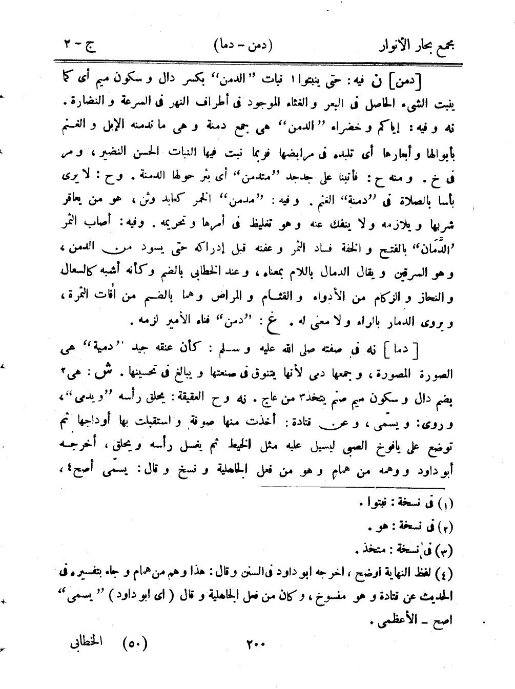 [دمن] ن فيه: حتى ينبتوا نبات "الدمن" بكسر دال وسكون ميم أي كما ينبت الشيء الحاصل في البعر والغثاء الموجود في أطراف النهر في السرعة والنضارة. نه وفيه: إياكم وخضراء "الدمن" هي جمع دمنة وهي ما تدمنه الإبل والغنم بأبوالها وأبعارها أي تلبده في مرابضها فربما نبت فيها النبات الحسن النضير، ومر في خ. ومنه ح: فأتينا على جدجد "متدمن" أي بئر حولها الدمنة. وح: لا يرى بأسًا بالصلاة في "دمنة" الغنم. وفيه:"مدمن" الخمر كعابد وثن، هو من يعاقر شربها ويلازمه ولاينفك عنه وهو تغليظ في أمرها وتحريمه. وفيه: أصاب الثمر "الدمان" بالفتح والخفة فساد الثمر وعفنه قبل إدراكه حتى يسود من الدمنن وهو السرقين ويقال الدمال باللام بمعناه، وعند الخطابي بالضم وكأنه أشبه كالسعال والنحاز والزكام من الأدواء والقثام والمراض وهما بالضم من آفات الثمرة، ويروى الدمار بالراء ولا معنى له. غ: "دمن" فناء الأمير لزمه.