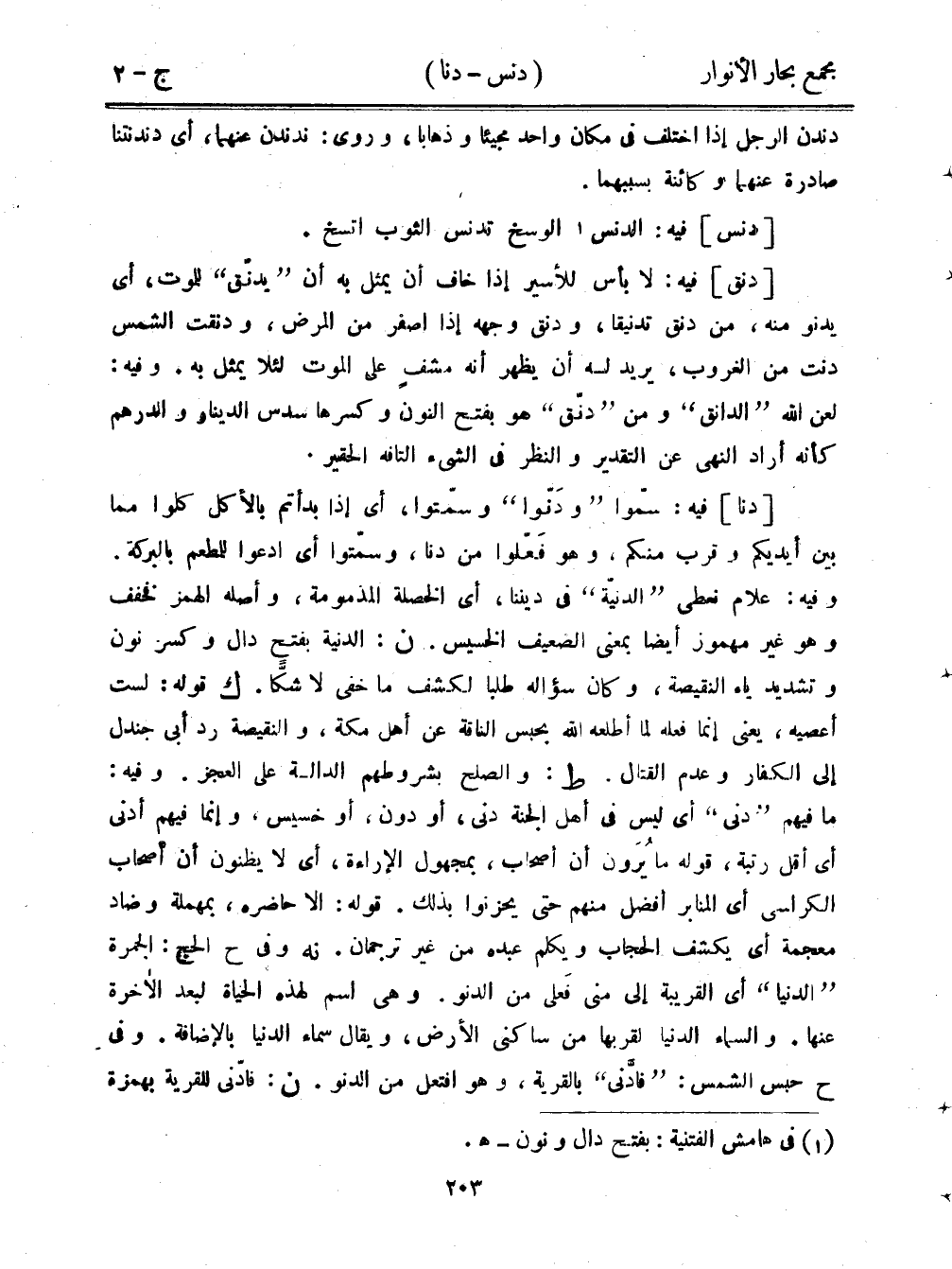 [دنا] فيه: سموا "ودنوا" وسمتوا، أي إذا بدأتم بالكل كلوا مما بين أيديكم وقرب منكم، وهو فعلوا من دنا، وسمتوا أي ادعوا للمطعم بالبركة. وفيه: علام نعطي "الدنية" في ديننا، أي الخصلة المذمومة، وأصله الهمز فخفف وهو غير مهموز ايضًا بمعنى الضعيف الخسيس. ن: الدنية بفتح دال وكسر نون وتشديد ياء النقيصة، وكان سؤاله طلبًا لكشف ما خفي لا شكا. ك قوله: لست أعصيه، يعني غنما فعله لما أطلعه الله بحبس الناقة عن أهل مكة، والنقيصة رد أبي جندل إلى الكفار وعدم القتال. ط: والصلح بشروطهم الدالة على العجز. وفيه: ما فيهم "دنى" أي ليس في أهل الجنة دنى، أو دون، أو خسيس، وإنما فيهم أدنى أي أقل رتبة، قوله ما يُرون أن أصحاب، بمجهول الإراءة، أي لا ينون أن أصحاب الكراسي أي المنابر أفضل منهم حتى يحزنوا بذلك. قوله: إلا حاضره، بمهملة وضاد معجمة أي يكشف الحجاب ويكلم عبده من غير ترجمان. نه وفي ح الحج: الجمرة "الدنيا" أي القريبة إلى منى فعلى من الدنو. وهي اسم لهذه الحياة لبعد الآخرة عنها. والسماء الدنيا لقربها من ساكني الأرض، ويقال سماء الدنيا بالإضافة. وفي ح حبس الشمس: "قادني" بالقرية، وهو افتعل من الدنو. ن: فادني للقرية بهمزة