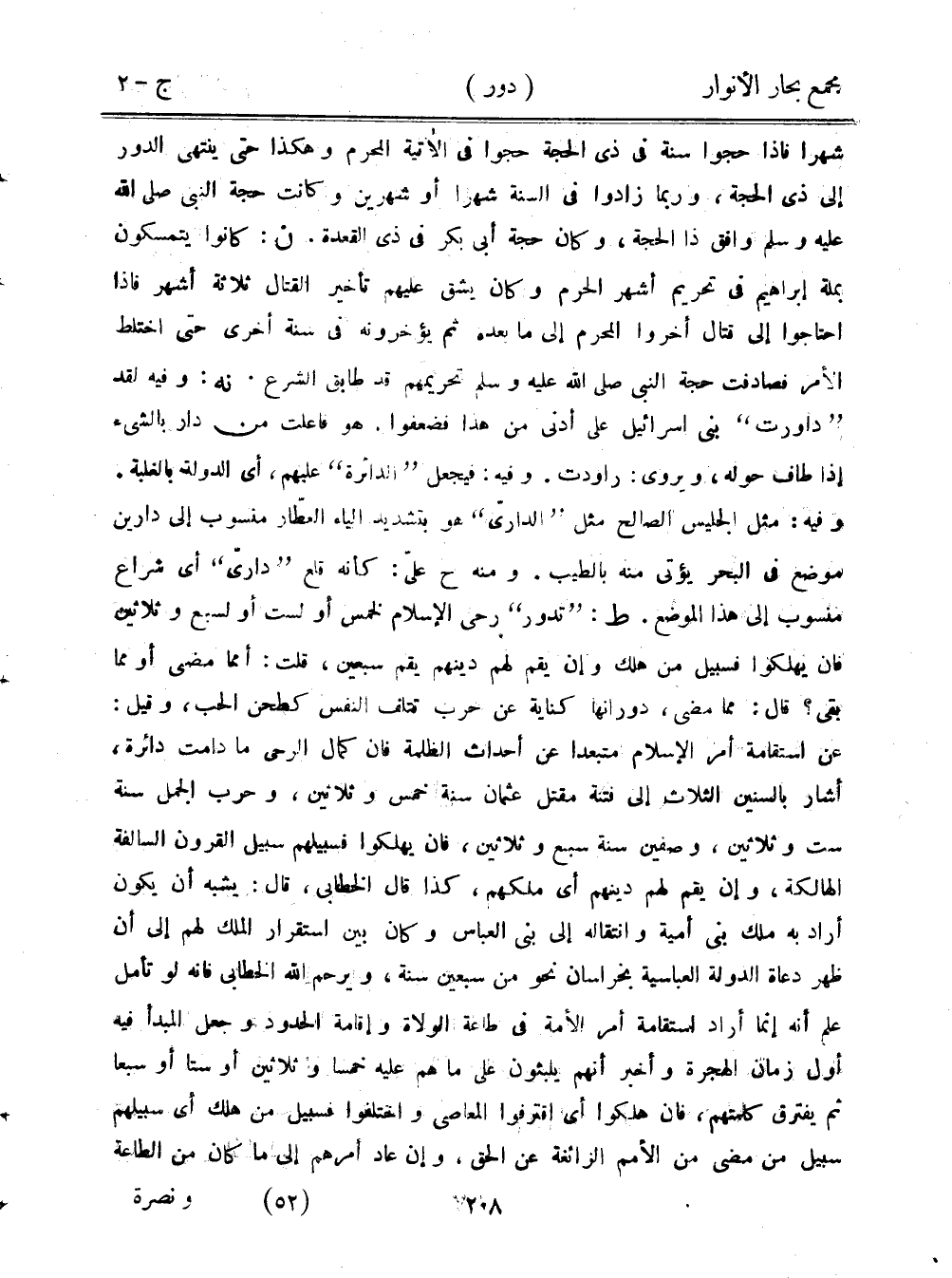 شهرًا فإذا حجوا سنة في ذي الحجة حجوا في الآتية المحرم وهكذا حتى ينتهي الدور إلى ذي الحجة، وربما زادوا في السنة شهرًا أو شهرين وكانت حجة النبي صلى الله عليه وسلم وافق ذا الحجة، وكان حجة أبي بكر في ذي القعدة. ن: كانوا يتمسكون بملة إبراهيم في تحريم أشهر الحرم وكان يشق عليهم تأخير القتال ثلاثة أشهر فإذا احتاجوا إلى قتال أخروا المحرم إلى ما بعده ثم يؤخرونه في سنة أخرى حتى اختلط الأمر فصادفت حجة النبي صلى الله عليه وسلم تحريمهم قد طابق الشرع. نه: وفيه لقد "داورت" بني إسرائيل على أدنى من هذا فضعفوا. هو فاعلت من دار بالشيء إذا طاف حوله، ويروي: راودت. وفيه: فيجعل "الدائرة" عليهم، أي الدولة بالغلبة. وفيه: مثل الجليس الصالح مثل "الداري" هو بتشديد الياء العطار منسوب إلى دارين موضع في البحر يؤتي منه بالطيب. ومنه ح عليّ: كأنه قلع "داري" أي شراع منسوب إلى هذا الموضع. ط: "تدور" رحى الإسلام لخمس أو لست أو لسبع وثلاثين فإن يهلكوا فسبيل من هلك وإن يقم لهم دينهم يقم سبعين، قلت: أمما مضى أو مما بقى؟ قال: مما مضى، دورانها كناية عن حرب تتلف النفس كطحن الحب، وقيل: عن استقامة أمر الإسلام متبعدًا عن أحداث الظلمة فإن كمال الرحى مادامت دائرة، أشار بالسنين الثلاث إلى فتنة مقتل عثمان سنة خمس وثلاثين، وحرب الجمل سنة ست وثلاثين، وصفين سنة سبع وثلاثين، فإن يهلكوا فسبيلهم سبيل القرون السالفة الهالكة، وإن يقم لهم دينهم أي ملكهم، كذا قال الخطابي، قال: يشبه أن يكون أراد به ملك بني أمية وانتقاله إلى بني العباس وكان بين استقرار الملك لهم إلى أن ظهر دعاة الدولة العباسية بخراسان نحو من سبعين سنة، ويرحم الله الخطابي فإنه لو تأمل علم أنه إنما أراد استقامة أمر الأمة في طاعة الولاة وإقامة الحدود وجعل المبدأ في أول زمان الهجرة وأخبر أنهم يلبثون على ما هم عليه خمسًا وثلاثين أو ستًا أو سبعًا ثم يفترق كلمتهم، فن هلكوا أي اقترفوا المعاصي واختلفوا فسبيل من هلك أي سبيلهم سبيل من مضى من الأمم الزائغة عن الحق، وإن عاد أمرهم إلى ما كان من الطاعة