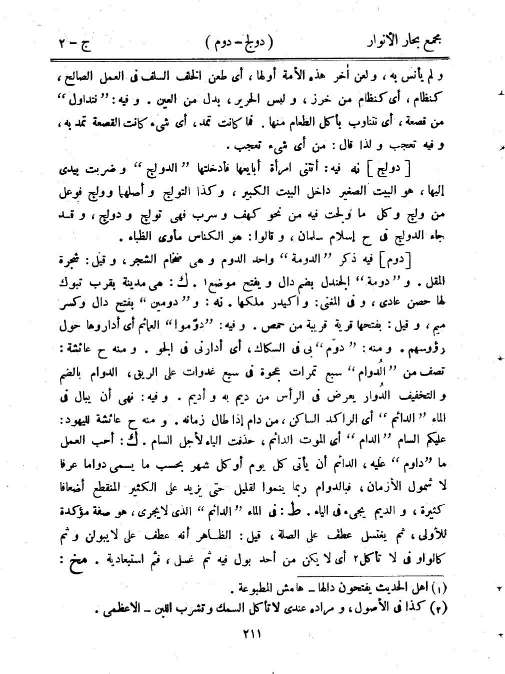 [دوم] فيه ذكر "الدومة" واحد الدوم وهي ضخام الشجر، وقيل: شجرة المقل. و"دومة" الجندل بضم دال ويفتح موضع. ك: هي مدينة بقرب تبوك لها حصن عادي، وفي المغني: وأكيدر ملكها. نه: و"دومين" بفتح دال وكسر ميم، وقيل بفتحها قرية قريبة من حمص. وفيه: "دوموا" العمائم أي أداروها حول رؤوسهم. ومنه: "دوم" بي في السكاك، أي أدارني في الجو. ومنه ح عائشة: تصف من "الدوام" سبع تمرات عجوة في سبع غدوات على الريق، الدوام بالضم والتخفيف الدوار يعرض في الرأس من ديم به وأديم. وفيه: نهى أن يبال في الماء "الدائم" أي الراكد الساكن، من دام إذا طال زمانه. ومنه ح عائشة لليهود: عليكم السام "الدام" أي الموت الدائم، حذفت الياء لأجل السام. ك: أحب العمل ما "داوم" عليه، الدائم أن يأتي كل يوم أو كل شهر بحسب ما يسمى دوامًا عرفًا لا شمول الأزمان، فبالدوام ربما ينمو القليل حتى يزيد على الكثير المنقطع أضعافًا كثيرة، والديم يجيء في الياء. ط: في الماء "الدائم" الذي لا يجري، هو صفة مؤكدة للأولى، ثم يغتسل عطف على الصلة، قيل: الظاهر أنه عطف على لا يبولن وثم كالواو في لا تأكل أي لا يكن من أحد بول فيه ثم غسل، فثم استبعادية. مخ: