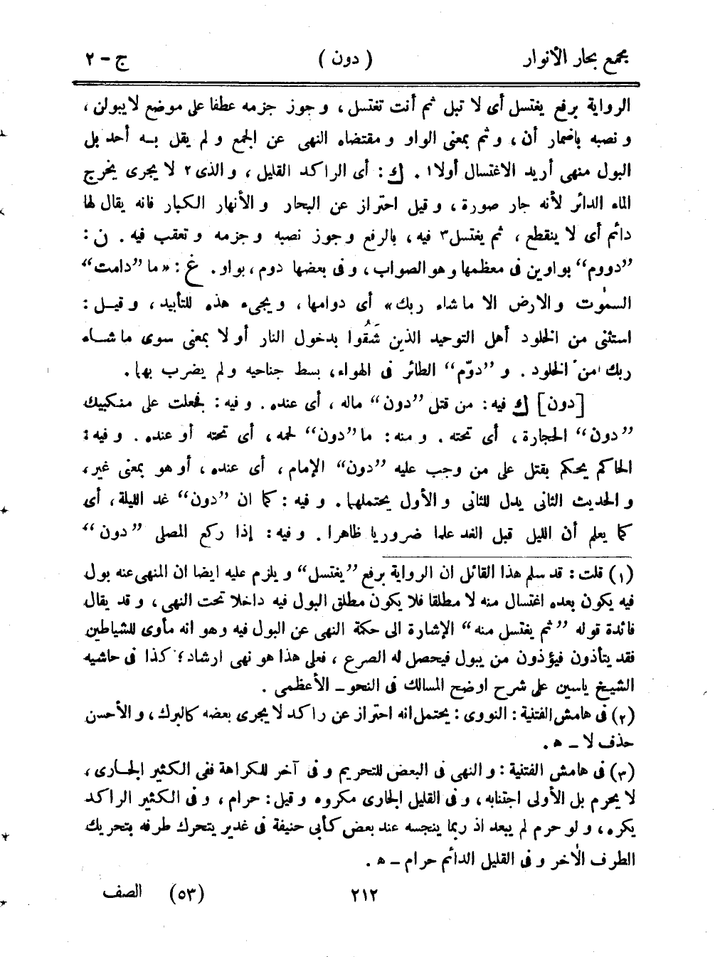 الرواية يرفع يغتسل أي لا تبل ثم أنت تغتسل، وجوز جزمه عطفًا على موضع لا يبولن، ونصبه بإضمار أن، وثم بمعنى الواو ومقتضاه النهي عن الجمع ولم يقل به أحد بل البول منتهى أريد الاغتسال أولا. ك: أي الراكد القليل، والذي لا يجري يخرج الماء الدائر لأنه جار صورة، وقيل احتراز عن البحار والأنهار الكبار فإنه يقال لها دائم أي لا ينقطع، ثم يغتسل فيه، بالرفع وجوز نصبه وجزمه وتعقب فيه. ن: "دووم" بواوين في معظمها وهو الصواب، وفي بعضها دوم، بواو. غ: "ما "دامت" السماوات والأرض إلا ما شاء ربك" أي دوامها، ويجيء هذه للتأبيد، وقيل: استثنى من الخلود أهل التوحيد الذي شقوا بدخول النار أو لا بمعنى سوى ما شاء ربك من الخلود. و"دوم" الطائر في الهواء، بسط جناحيه ولم يضرب بهما.