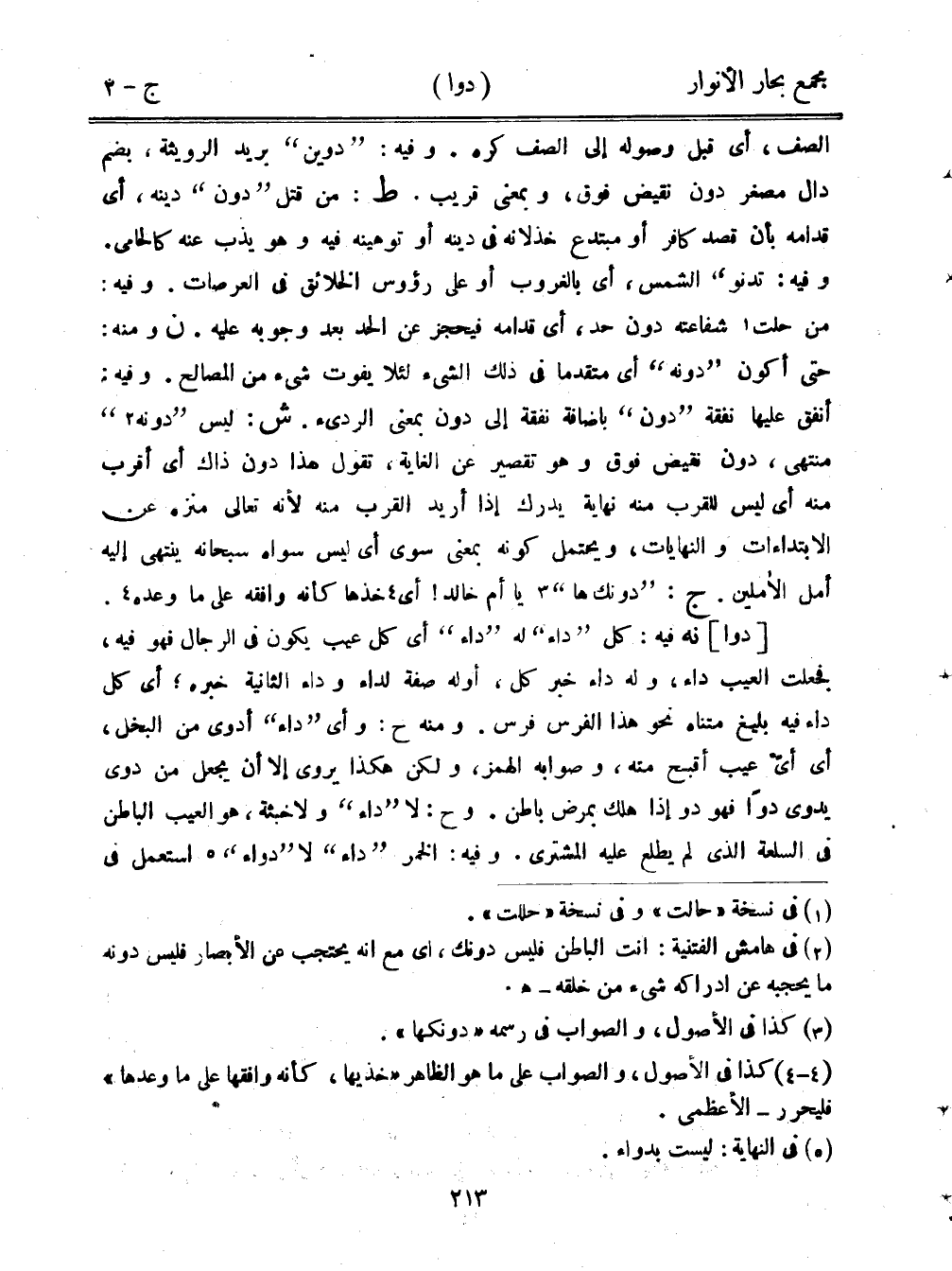 الصف، أي قبل وصوله إلى الصف كره. وفيه: "دوين" بريد الرويثة، بضم دال مصغر دون نفيض فوق، وبمعنى قريب. ط: من قتل "دون" دينه، أي قدامه بن قصد كافر أو مبتدع خذلانه في دينه أو توهينه فيه وهو يذب عنه كالحامي. وفيه: "تدنو" الشمس، أي بالغروب أو على رؤوس الخلائق في العرصات. وفيه: من حلت شفاعته دون حد، أي قدامه فيحجز عن الحد بعد وجوبه عليه. ن ومنه: حتى أكون "دونه" أي متقدمًا في ذلك الشيء لئلا يفوت شيء من المصالح. وفيه: أنفق عليها نفقة "دون" بإضافة نفقة إلى دون بمعنى الرديء. ش: ليس "دونه" منتهى، دون نقيض فوق وهو تقصير عن الغاية، تقول هذا دون ذاك أي أقرب منه أي ليس للقرب منه نهاية يدرك إذا أريد القرب منه لأنه تعالى منزه عن الابتداءات والنهايات، ويحتمل كونه بمعنى سوى أي ليس سواه سبحانه ينتهي إليه أمل الأملين. ج: "دونك ها" يا أم خالد! أي خذها كأنه وافقه على ما وعده.