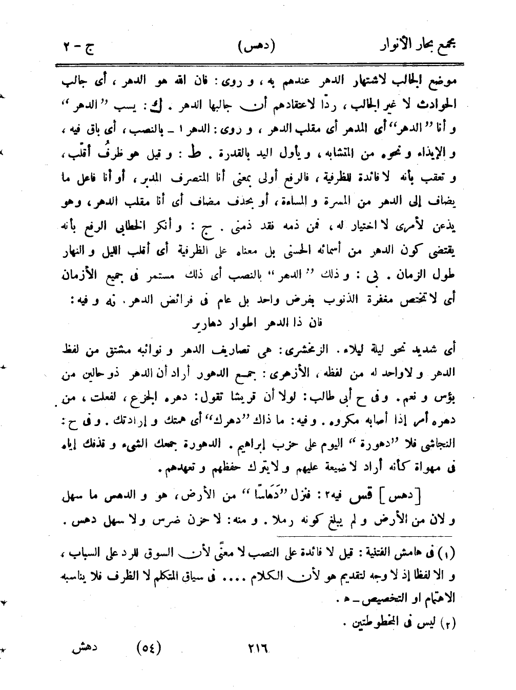 أي شديد نحو ليلة ليلاء. الزمخشري: هي تصاريف الدهر ونوائبه مشتق من لفظ الدهر ولا واحد له من لفظه، الأزهري: جمع الدهور أراد أن الدهر ذو حالين من بؤس ونعم. وفي ح أبي طالب: لولا أن قريشًا تقول دهره الجزع، لفعلت، من دهره أمر ذا أصابه مكروه. وفيه: ما ذاك "دهرك" أي همتك وإرادتك. وفي ح: النجاشي فلا "دهورة" اليوم على حزب إبراهيم. الدهورة جمعك الشيء وقذفك إياه في مهواة كأنه أراد لا ضيعة عليهم ولا يترك حفظهم وتعهدهم.