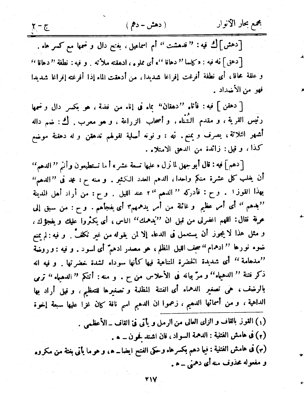 [دهم] فيه: قال أبو جهل لما نزل "عليها تسعة عشر" أما تستطيعون وأنتم "الدهم" أن يغلب كل عشرة منكم واحدًا، الدهم العدد الكثير. ومنه ح: محمد في "الدهم" بهذا القوز. وح: فأدركه "الدهم" عند الليل. وح: من أراد أهل المدينة "بدهم" أي أمر عظيم وغائلة من أمر يدهمهم أي يفجأهم. وح: من سبق إلى عرفة فقال: اللهم اغفر لي من قبل أن "يدهمك" الناس، أي يكثروا عليك ويفجؤك، ومثل هذا لا يجوز أن يستعمل في الدعاء إلا لمن يقوله من غير تكلف. وفيه: لم يمنع ضوء نورها "دهمام" سجف الليل المظلم، هو مصدر ادهم أي اسود. وفيه: وروضة "مدهامة" أي شديدة الخضرة المتناهية فيها كأنها سوداء لشدة خضرتها. وفيه أنه ذكر فتنة "الدهيماء" ومر بيانه في الأحلاس من ح. ومنه: أتتكم "الدهيماء" ترمي بالرضفن هي تصغير الدهماء أي الفتنة الملمة وتصغيرها للتعظيم، وقيل أراد بها الداهية، ومن أسمائها الدهيم، زعموا أن الدهيم اسم ناقة كان غزا عليها سبعة إخوة