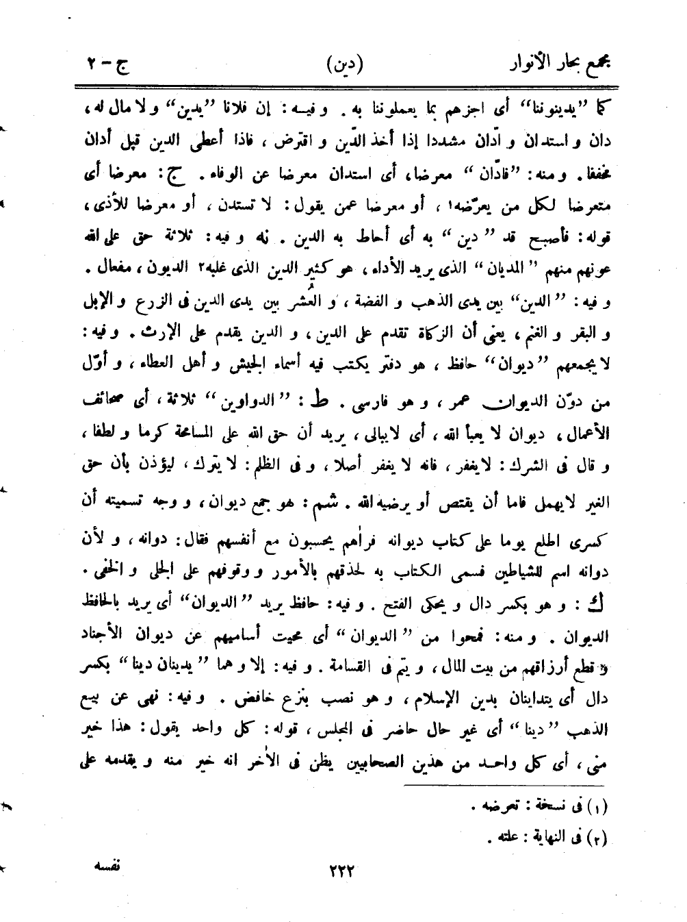 كما "يدينوننا" أي اجزهم بما يعملوننا به. وفيه: إن فلانًا "يدين" ولا مال له، دان واستدان وادان مشددًا إذا أخذ الدين واقترض، فإذا أعطى الدين قبل أدان مخففًا. ومنه: "فأدان" معرضًا، أي استدان معرضًا عن الوفاء. ج: معرضًا أي متعرضًا لكل من يعرضه، أو معرضًا عمن يقول: لاتستدن، أو معرضًا للأذى، قوله: فأصبح قد "دين" به أي أحاط به الدين نه وفيه: ثلاثة حق على الله عونهم منهم "المديان" الذي يريد الأداء، وهو كثير الدين الذي غلبه الديون، مفعال. وفيه: "الدين" بين يدي الذهب والفضة، والعشر بين يدي الدين في الزرع والإبل والبقر والغنم، يعني أن الزكاة تقدم على الدين، والدين يقدم على الإرث. وفيه: لا يجمعهم "ديوان" حافظ، هو دفتر يتب فيه أسماء الجيش وأهل العطاء، وأول من دون الديوان عمر، وهو فارسي. ط: "الدواوين" ثلاثة، أي صحائف الأعمال، ديوان لا يعبأ الله، أي لا يبالي، يريد أن حق الله على المسامحةكرمًا ولطفا، وقال في الشرك: لا يغفر، فإنه لا يغفر أصلًا، وفي الظلم لا يترك، ليؤذن بأن حق الغير لا يهمل فأما أن يقتص او يرضيه الله. شم: هو جمع ديوان، ووجه تسميته أن كسرى اطلع يومًا على كتاب ديوانه فرأهم يحسبون مع أنفسهم فقال دوانه، ولأن دوانه اسم للشياطين فسمى الكتاب به لحذقهم بالأمور ووقوفهم على الجلي والخفي. ك: وهو بكسر دال ويحكي الفتح. وفيه: حافظ يريد "الديوان" أي يريد بالحافظ الديوان. ومنه: فمحوا من "الديوان" أي محيت أساميهم عن ديوان الجناد وقطع أرزاقهم من بيت المال، ويتم في القسامة. وفيه: إلا وهما "يدينان دينًا" بكسر دال أي يتداينان بدين الإسلام، وهو نصب بنزع خافض. وفيه: نهى عن بيع الذهب "دينا" أي غير حال حاضر في المجلس، قوله: كل واحد يقول: هذا خير منى، أي كل واحد من هذين الصحابيين يظن في الآخر نه خير منه ويقدمه على