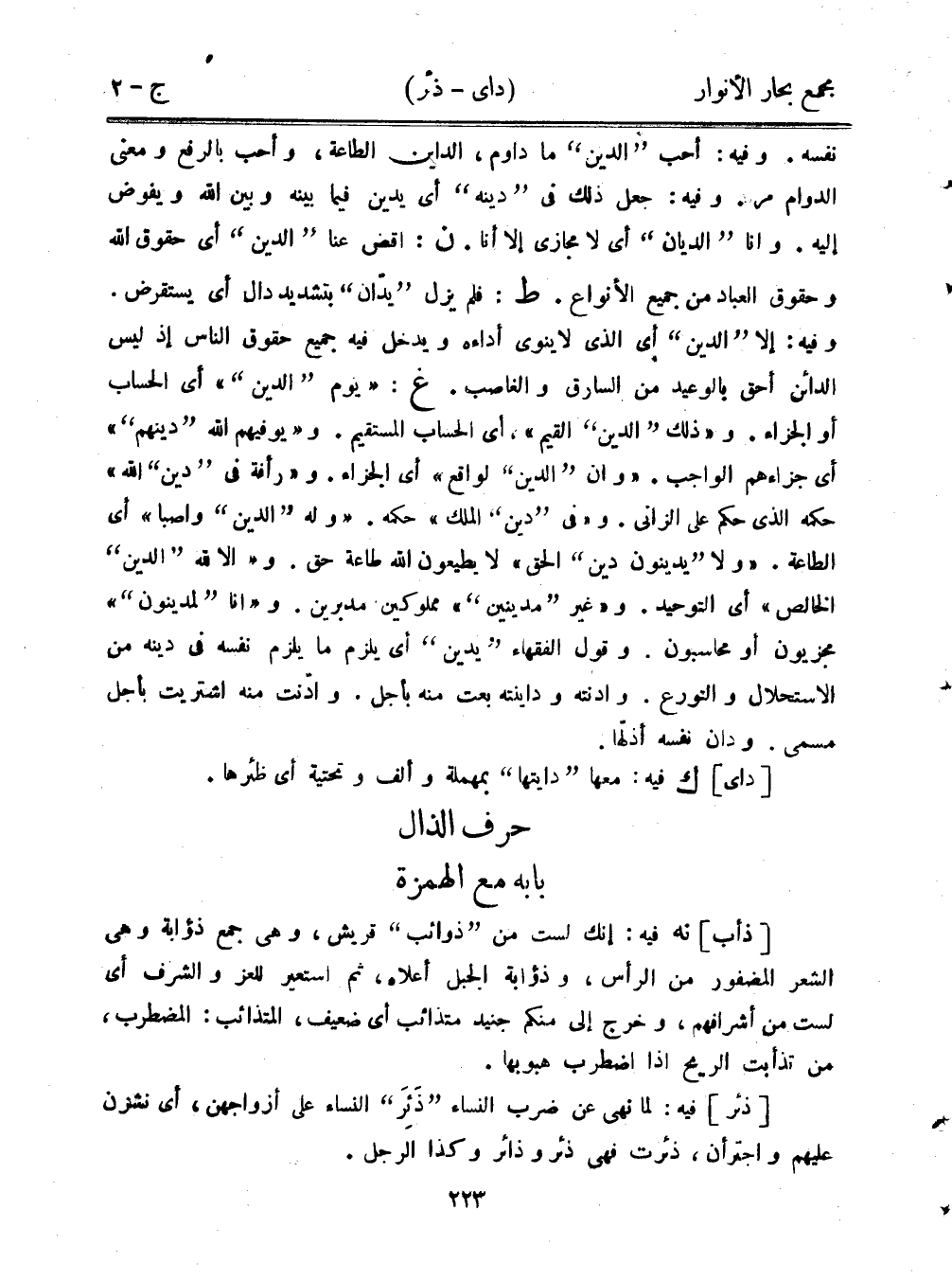 نفسه. وفيه: أحب "الدين" ما داوم، الداين الطاعة، وأحب بالرفع ومعنى الدوام مر. وفيه: جعل ذلك في "دينه" أي يدين فيما بينه وبين الله ويفوض إليه. وأنا "الديان" أي لا مجازي إلا أنا. ن: اقص عنا "الدين" أي حقوق الله وحقوق العباد من جميع الأنواع. ط: فلم يزل "يدان" بتشديد دال أي يستقرض. وفيه: إلا "الدين" أي الذي لا ينوي أداءه ويدخل فيه جميع حقوق الناس إذ ليس الدائن أحق بالوعيد من السارق والغاصب. غ: "يوم "الدين"" أي الحساب أو الجزاء. و"ذلك "الدين" القيم"، أي الحساب المستقيم. و"يوفيهم الله "دينهم"" أي جزاءهم الواجب. "وأن "الدين" لواقع" أي الجزاء. و"رأفة في "دين" الله" حكمه الذي حكم على الزاني. و"في "دين" الملك" حكمه. "وله "الدين" واصبا" أي الطاعة. "ولا "يدينون دين" الحق" لا يطيعون الله طاعة حق. و"إلا لله "الدين" الخالص" أي التوحيد. و"غير "مدينين"" مملوين مدبرين. و"أنا "لمدينون"" مجزيون أو محاسبون. وقول الفقهاء "يدين" أي يلزم ما يلزم نفسه في دينه من الاستحلال والتورع. وادنته وداينته بعت منه بأجل. وادنت منه اشتريت بأجل مسمى. ودان نفسه أذلها.