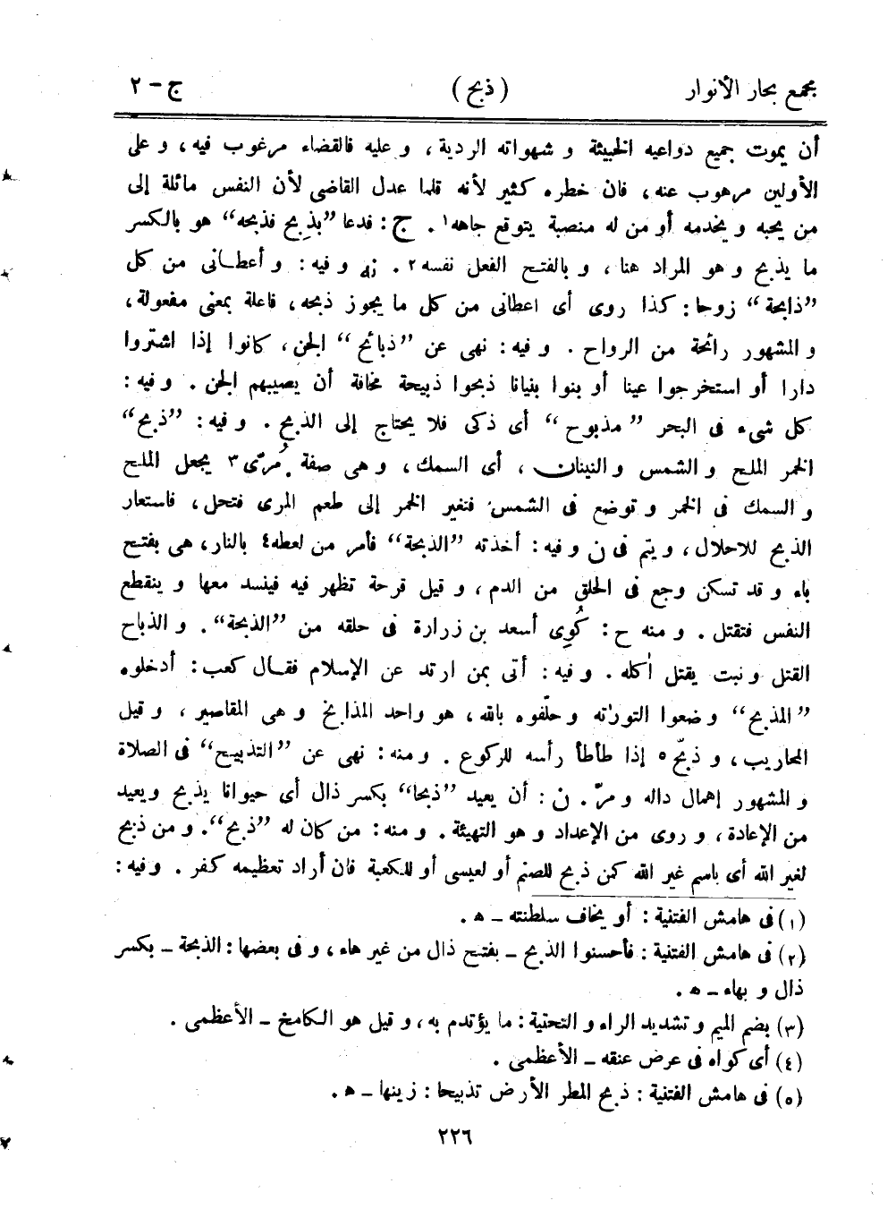 أن يموت جميع دواعيه الخبيثة وشهواته الردية، وعليه فالقضاء مرغوب فيه، وعلى الأولين مرهوب عنه، فإن خطره كثير لأنه قلما عدل القاضي لأن النفس مائلة إلى من يحبه ويخدمه أو من له منصبة يتوقع جاهه. ج: فدعا "بذبح فذبحه" هو بالكسر ما يذبح وهو المراد هنا، وبالفتح الفعل نفسه. نه وفيه: وأعطاني من كل "ذابحة" زوجا: كذا روى أن أعطاني من كل ما يجوز ذبحه، فاعلة بمعنى مفعولة، والمشهور رائحة من الرواح. وفيه نهى عن "ذبائح" الجن، كانوا إذا اشتروا دارًا أو استخرجوا عينًا أو بنوا بنيانًا ذبحوا ذبيحة مخافة أن يصيبهم الجن. وفيه: "ذبح" الخمر الملح والشمس والنينان، أي السمك، وهي صفة مُري يجعل الملح والسمك في الخمر وتوضع في الشمس فتغير الخمر إلى طعم المري فتحل، فاستعار الذبح للإحلال، ويتم في ن وفيه: أخذته "الذبحة" فأمر من لعطه بالنار، هي بفتح باء وقد تسكن وجع في الحلق من الدم، وقيل قرحة تظهر فيه فينسد معها وينقطع النفس فتقتل. ومنه ح: كُوى أسعد بن زرارة في حلقه من "الذبحة". والذباح القتل ونبت يقتل أكله. وفيه: أتى بمن ارتد عن الإسلام فقال كعب: أدخلوه "المذبح" وضعوا التوراة وحلفوه بالله، هو واحد المذابح وهي المقاصير، وقيل المحاريب، وذبح إذا طأطأ رأسه للركوع. ومنه: نهى عن "التذبيح" في الصلاة والمشهور إهمال داله ومر. ن: أن يعيد "ذبحًا" بكسر ذال أو حيوانًا يذبح ويعيد من الإعادة، وروى من الإعداد وهو التهيئة. ومنه: من كان له "ذبح". ومن ذبح لغير الله أي باسم غير الله كمن ذبح للصنم أو لعيسى أو للكعبة فإن أراد تعظيمه كفر. وفيه: