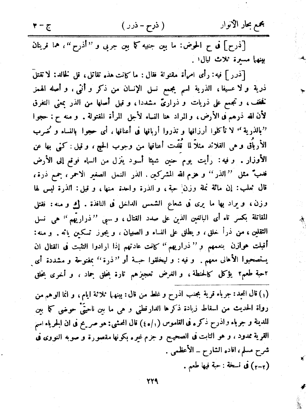 [ذرر] فيه: رأى امرأة مقتولة فقال: ما كانت هذه تقاتل، قل لخالد: لا تقتل ذرية ولا عسيفا، الرية اسم يجمع نسل الإنسان من ذكر وأنثى، وأصله الهمز فخفف، وتجمع على ذريات وذراري مشددًا، وقيل أصلها من الذر بمعنى التفرق لأن الله ذرهم في الأرض، والمراد هنا النساء لأجل المرأة المقتولة. ومنه ح: حجوا "بالذرية" لا تأكلوا أرزاقها وتذروا أرباقها في أعناقها، أ] حجوا بالنساء وضرب الأرياق وهي القلائد مثلًا لما قلدت أعناقها من وجوب الحج، وقيل: كنى بها عن الأوزار. وفيه: رأيت يوم حنين شيئًا أسود ينزل من السماء فوقع إلى الأرض فدب مثل "الذر" وهزم الله المشركين. الذر النمل الصغير الأحمر، جمع ذرة، قال ثعلب: إن مائة نملة وزن حبة، والذرة واحدة منها، وقيل: الذرة ليس لها وزن، ويراد بها ما يرى في شعاع الشمس الدالخ في النافذة. ك ومنه: فقتل المقاتلة بكسر تاء أي البالغين الذين على صدد القتال، وسبى "ذراريهم" هي نسل الثقلين، من ذرأ خلق، ويطلق على النساء والصبيان، ويجوز تسكين يائه. ومنه أقبلت هوازن بنعمهم و"ذراريهم" كانت عادتهم إذا أرادوا التثبت في القتال أن يستصحبوا الأهالي معهم. وفيه: وليخلقوا حبة أو "ذرة" بمفتوحة ومشددة أي حبة طعم يؤكل كالحنطة، والغرض تعجيزهم تارة بخلق جماد، وأخرى بخلق