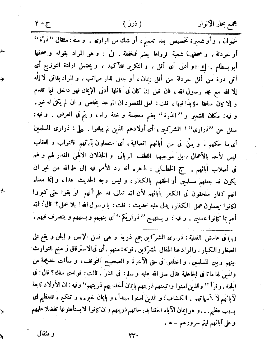 حيوان، وأو شعيرة تخصيص بعد تعميم، أو شك من الراوي. ومنه: مثقال "ذرة" أو خردلة، وصحفها شعبة فرواها بضم فمخففة. ن: وهو المراد بقوله وصحفها أبو بسطام. ك: وأدنى أي أقلن والتكرير للتأيد، ويحتمل إرادة التوزيع أي أقل ذرة من أقل خردلة من أقل يمان، أو جعل للنار مراتبن والمراد بقائل لا إله إلا الله مع محمد رسول الله، فإن قيل إن كان في قائلها أدنى الإيمان فهو داخل فيما تقدم وإلا كان منافقًا مؤبدًا فيها، قلت: لعل المقصود أن الموحد يخلص وإن لم يكن له خير. وفيه: مكان الشعير و"الذرة" بضم معجمة وخفة راء، ويتم في العرض. وفيه: سئل عن "ذراري" المشركين، أي أولادهم الذين لم يبلغوا. ط: ذراري المسلمين أي ما حكمهم، ومن في من أبائهم اتصالية، أي متصلون بآبائهم فالثواب والعقاب ليس لحد بالأعمال، بل موجبهما اللطف الرباني والخذلان الإلهي المقدر لهم وهم في أصلاب آبائهم. ج الخطابي: ظاهره أنه رد الأمر فيه إلى علم الله من غير أن يكون قد جعلهم مسلمين أو ألحقهم بالكفار، وليس وجه الحديث هذا، وإنما معناه أنهم كفار ملحقون في الكفر بآبائهم لأن الله تعالى قد علم أنهم لو بقوا حتى كبروا لكانوا يعملون عمل الكفار، يدل عليه حديث: قلت: يا رسول الله! بلا عمل؟ قال: الله أعلم بما كانوا عاملين. وفيه: ويستبيح "ذراريكم" أي ينهبهم ويسبيهم ويتصرف فيهم.