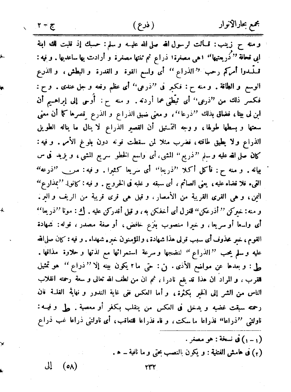 ومنه ح زينب: قالت لرسول الله صلى الله عليه وسلم: حسبك إذ قلبت لك ابنة أبي قحافة "ذُريعتيها" هي مصغرة ذراع ثم ثنتها مصغرة وأرادت بها ساعديها. وفيه: قلدوا أمركم رحب "الذراع" أي واسع القوة والقدرة والبطش، والذرع الوسع والطاقة. ومنه ح: فكبر في "ذرعى" أي عظم وقعه وجل عندي. وح: فكسر ذلك من "ذرعى" أي ثبطني عما أردته. ومنه ح: أوحى إلى إبراهيم أن ابن لي بيتًا، فضاق بذلك "ذرعًا"، ومعنى ضيق الذراع والذرع قصرها كما أن معنى سعتها وبسطها طولها، ووجه التمثيل أن القصير الذراع لا ينال ما يناله الطويل الذراع ولا يطيق طاقته، فضرب مثلًا لمن سقطت نونه دون بلوغ الأمر. وفيه: كان صلى الله عليه وسلم "ذريع" المشي، أي واسع الخطو سريع المشي، ويزيد في س بيانه. ومنه ح: فأكل أكلًا "ذريعًا" أي سريعًا كثيرًا. وفيه: من "ذرعه" القيء فلا قضاء عليه، يعني الصائم، أي سبقه وغلبه في الخروج. وفيه: كانوا "بمذارع" اليمن، وهي القرى القريبة من الأمصار، وقيل هي قرى قريبة من الريف والبر. ومنه: خيركن "أذرعكن" للمغزل أي أخفكن به، وقيل أقدركن عليه. ك: موتًا "ذريعًا" أي واسعًا أو سريعًا، وخيرًا منصوب بنزع خافض، أو صفة مصدر، قوله: شهادة القوم، خبر محذوف أي سبب قولي هذا شهادة، والمؤمنون خبره شهداء. وفيه: كان صلى الله عليه وسلم يحب "الذراع" لنضجها وسرعة استمرائها مع لذتها وحلاوة مذاقها. ط: وبعدها عن مواضع الأذى. ن: حتى ما يكون بينه إلا "ذراع" هو تمثيل للقرب، والمراد أن هذا قد يقع نادرًا، ثم أن من لطف الله تعالى وسعة رحمته انقلاب الناس من اشر إلى الخير بكثرة، وأما العكس ففي غاية الندور ونهاية القلة فإن رحمته سبقت غضبه ويدخل في العكس من ينقلب بكفر أو معصية. ط وفيه: ناولتني "ذراعًا" فذراعًا ما سكت، وفاء فراعًا للتعاقب، أي ناولتني ذراعًا غب ذراع